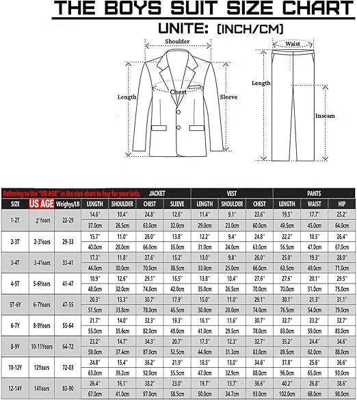 With sizes ranging from 6-14 years, this suit is designed to fit boys of different ages and sizes comfortably. The set includes options for a coat, pants, vest, and tie, allowing you to choose the perfect combination for your child's needs.