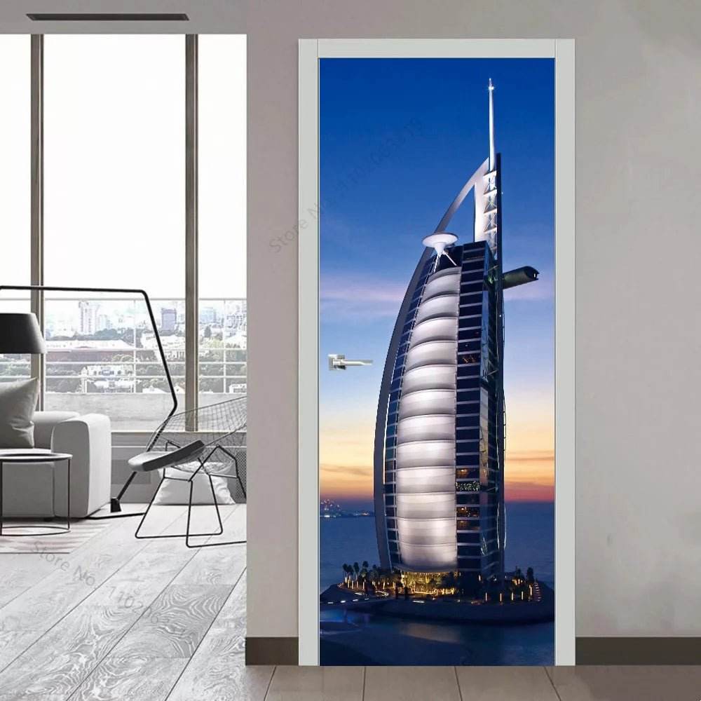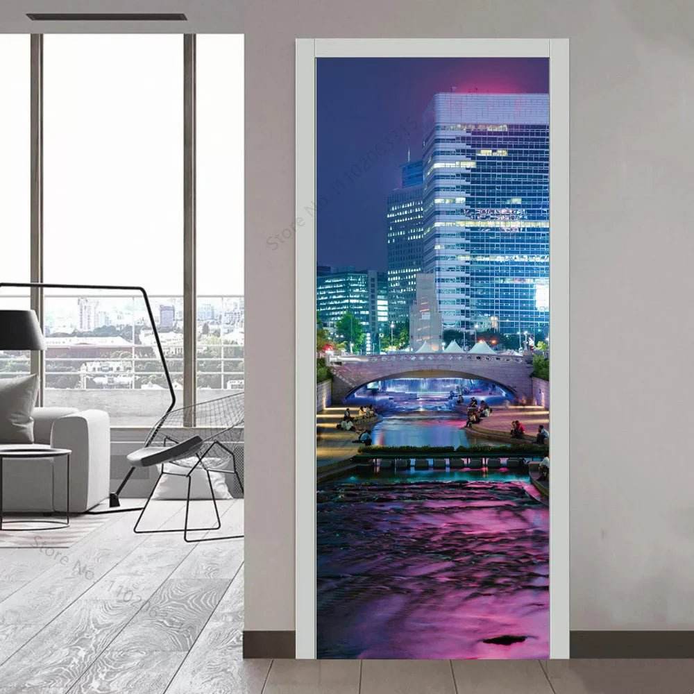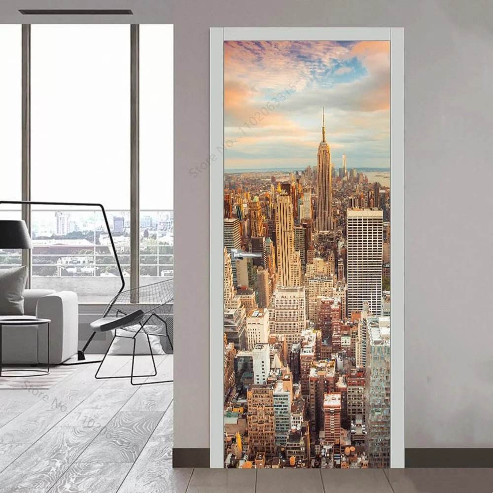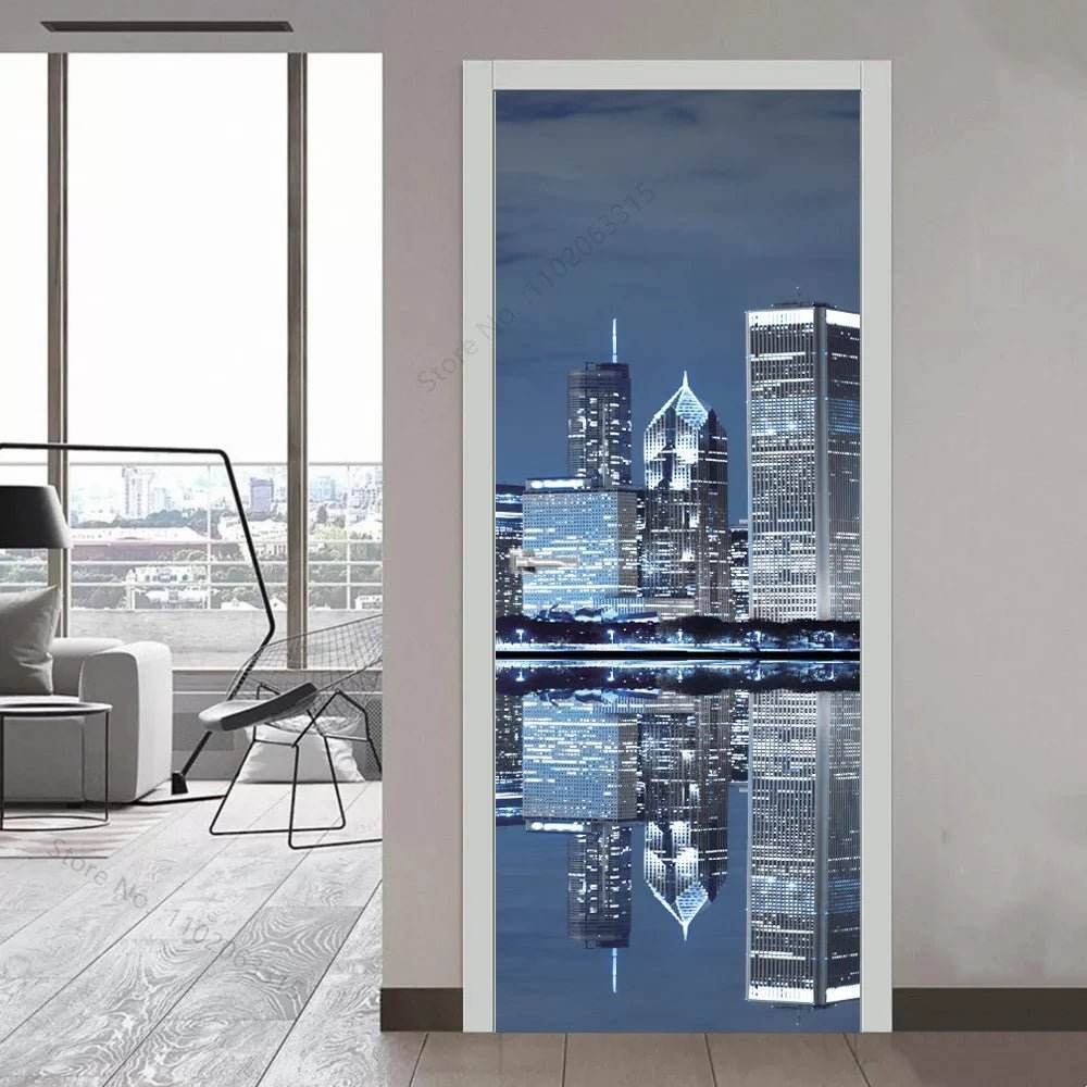 Elevate your home decor with the Custom Modern Minimalist 3D Skyscraper Door Wallpaper and enjoy a touch of urban sophistication in your everyday life.