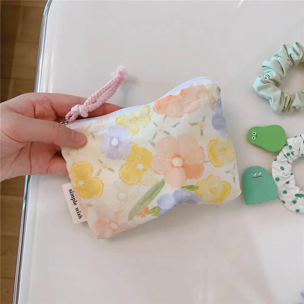 The images showcase the bag's beautiful floral patterns and compact design, highlighting its practicality and style. The vibrant colors and soft fabric make it a delightful addition to any accessory collection.