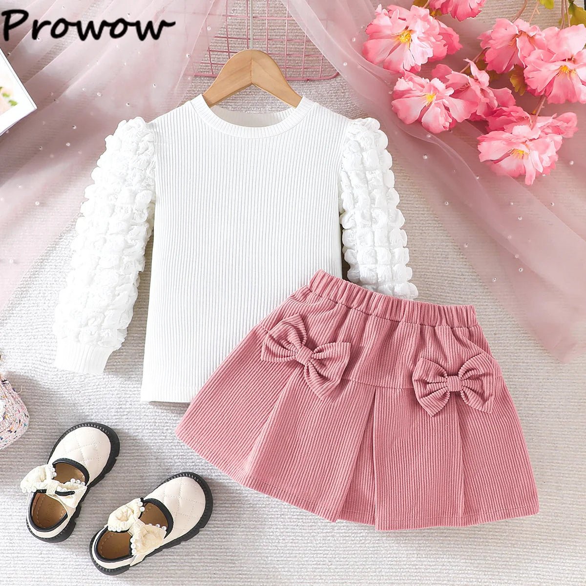The set features a crisp white top with intricate puff sleeves, paired with a soft pink skirt adorned with cute bow accents. This combination not only looks adorable but also allows for easy movement, perfect for playdates or family outings.
