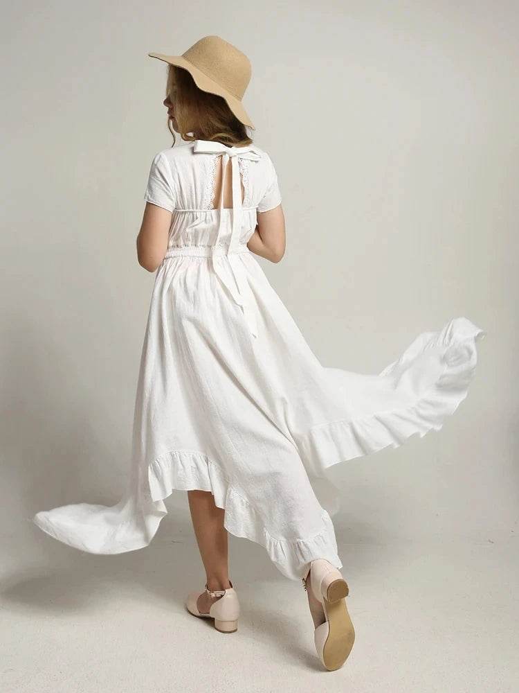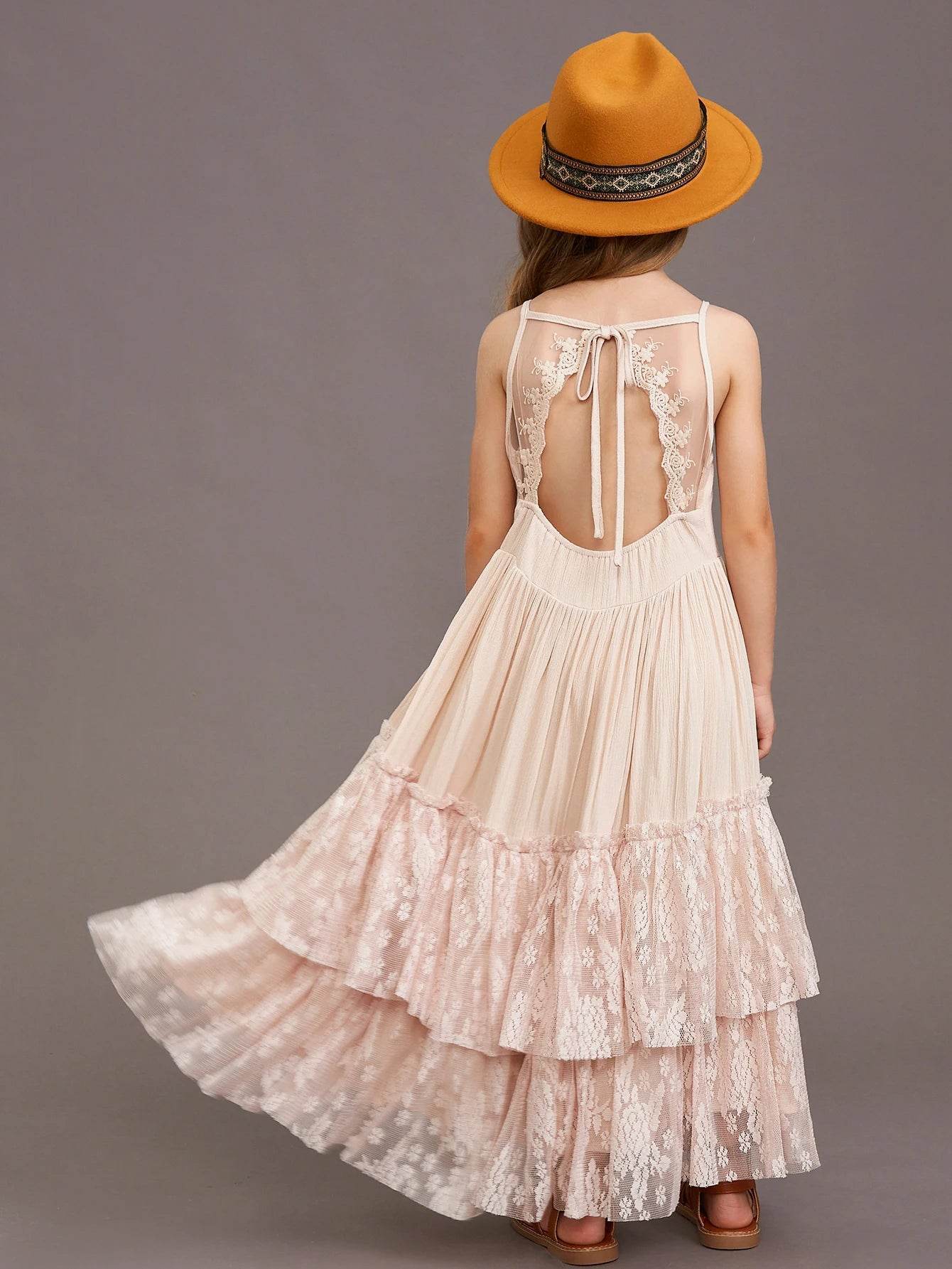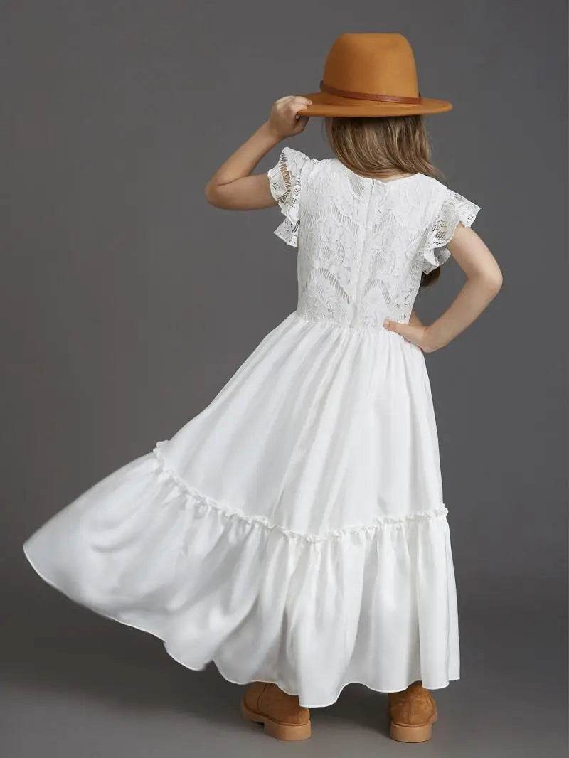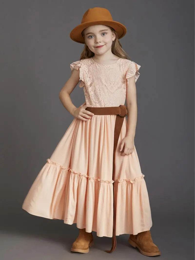In the images, the dress is beautifully showcased, highlighting its intricate lace patterns and flowing design. The charming look is complemented by accessories like hats and boots, adding a touch of playful elegance. Your little one will love twirling around in this enchanting dress, feeling every bit the princess she is.