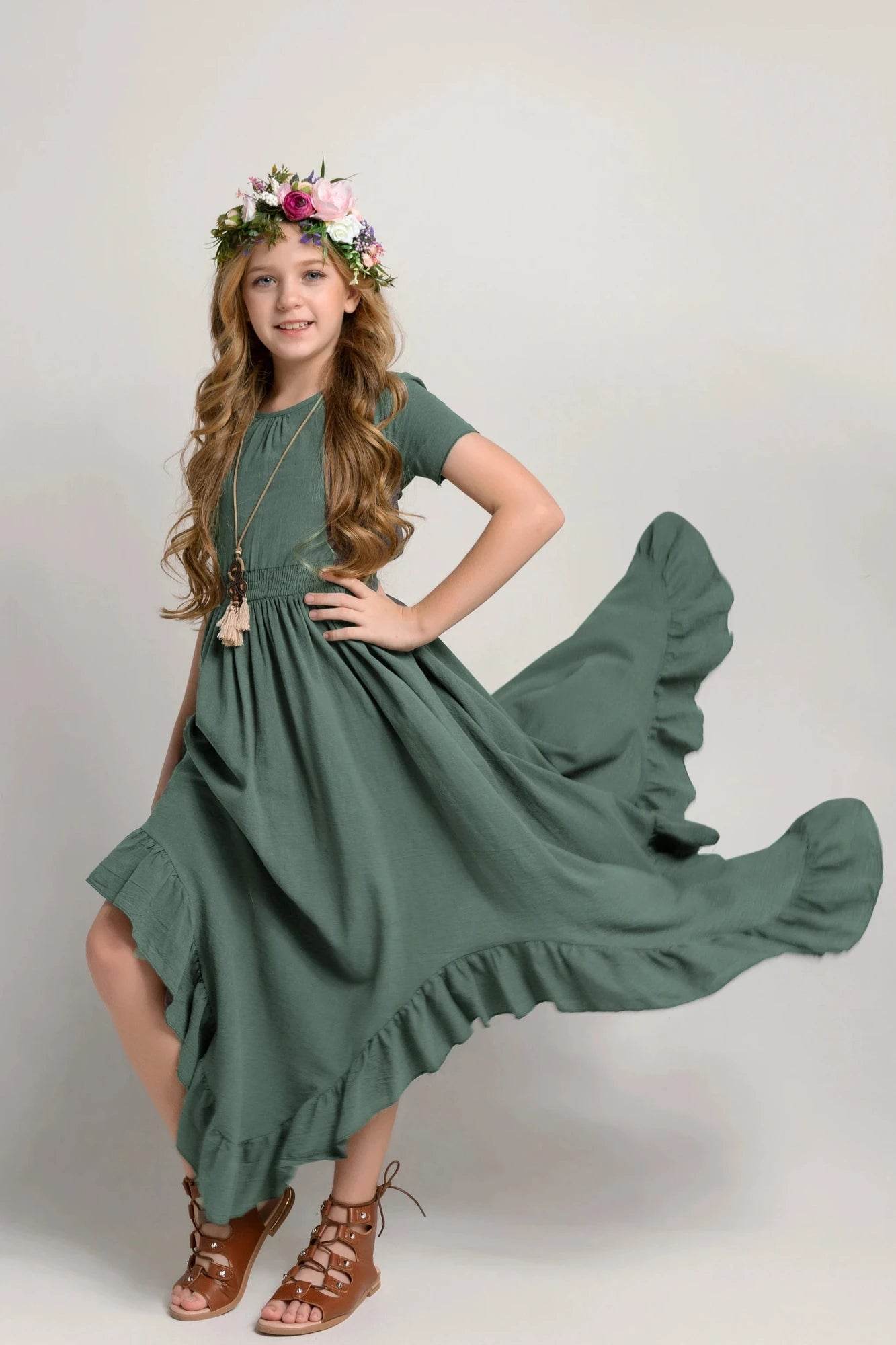 The dress features a flowing silhouette with layers of soft lace, creating a dreamy and graceful appearance. Available in a variety of colors such as Green, Purple, Pink Champagne, and classic White, you can choose the perfect shade to match the occasion. The dress is designed to fit girls aged 4 to 17, with sizes ranging from 4y to 14, ensuring a perfect fit for every princess.