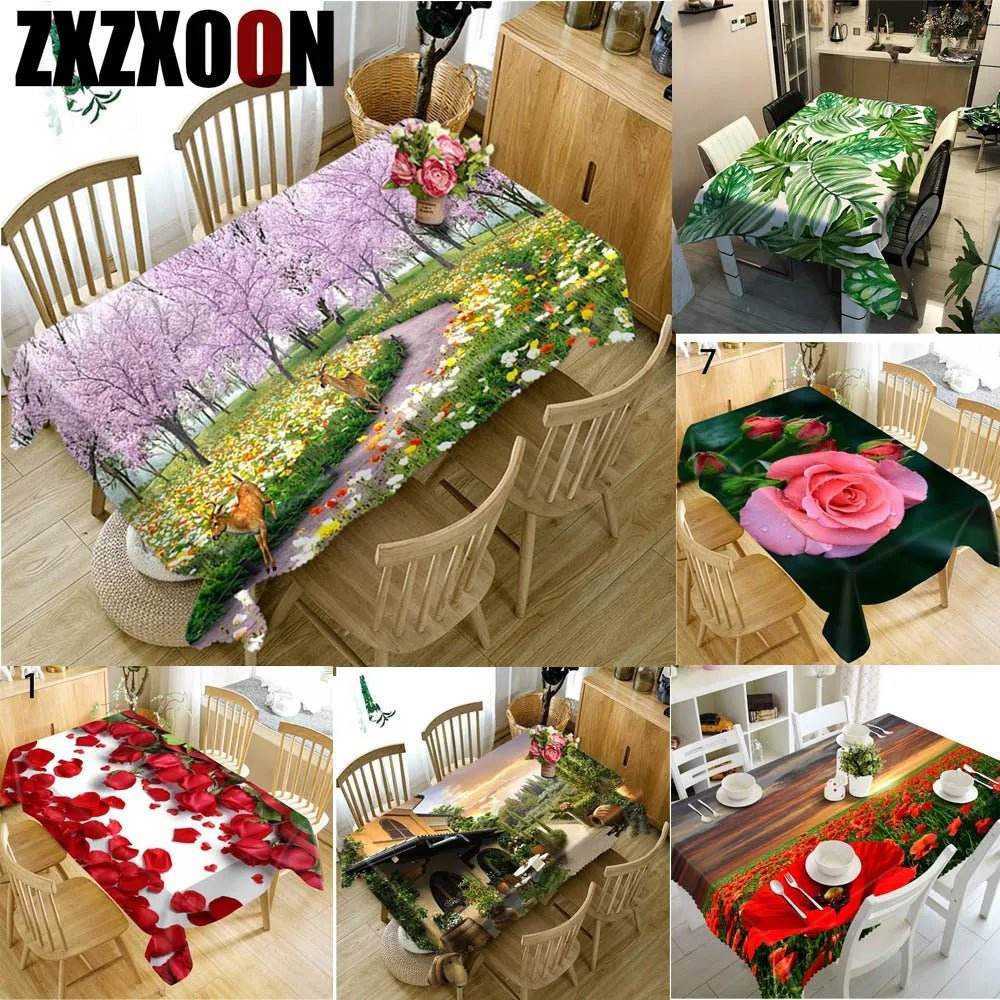 The images showcase the tablecloth draped over a dining table, highlighting its vibrant red roses that seem to bloom across the surface. The lush floral design creates a warm and welcoming atmosphere, perfect for family gatherings or entertaining guests.