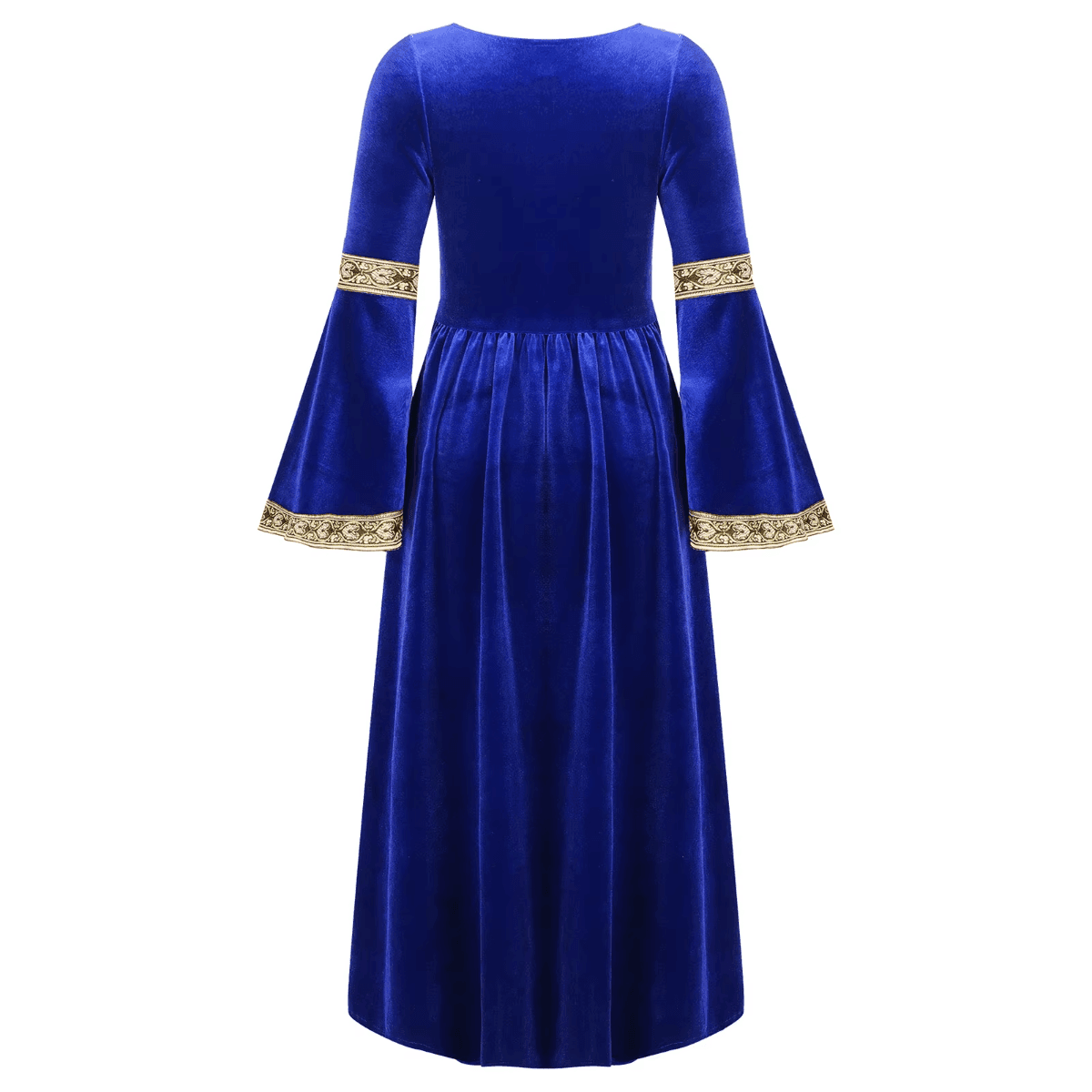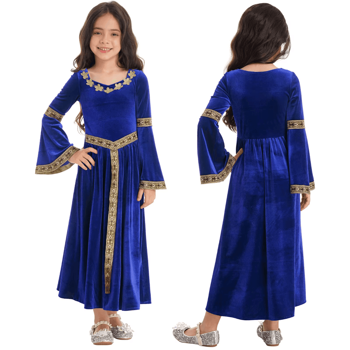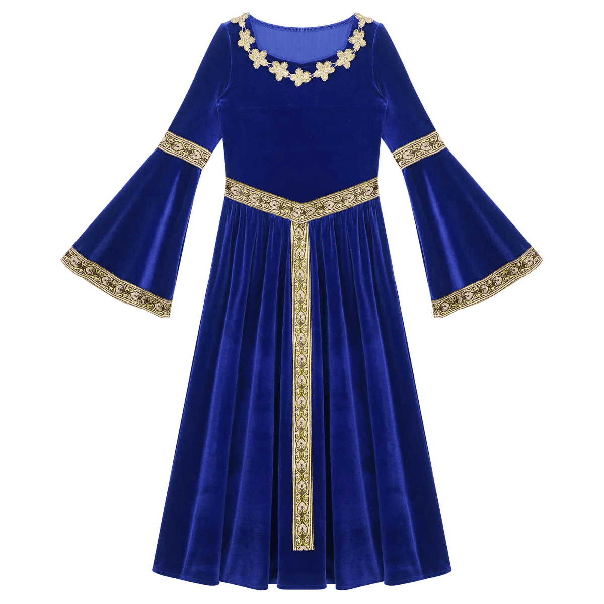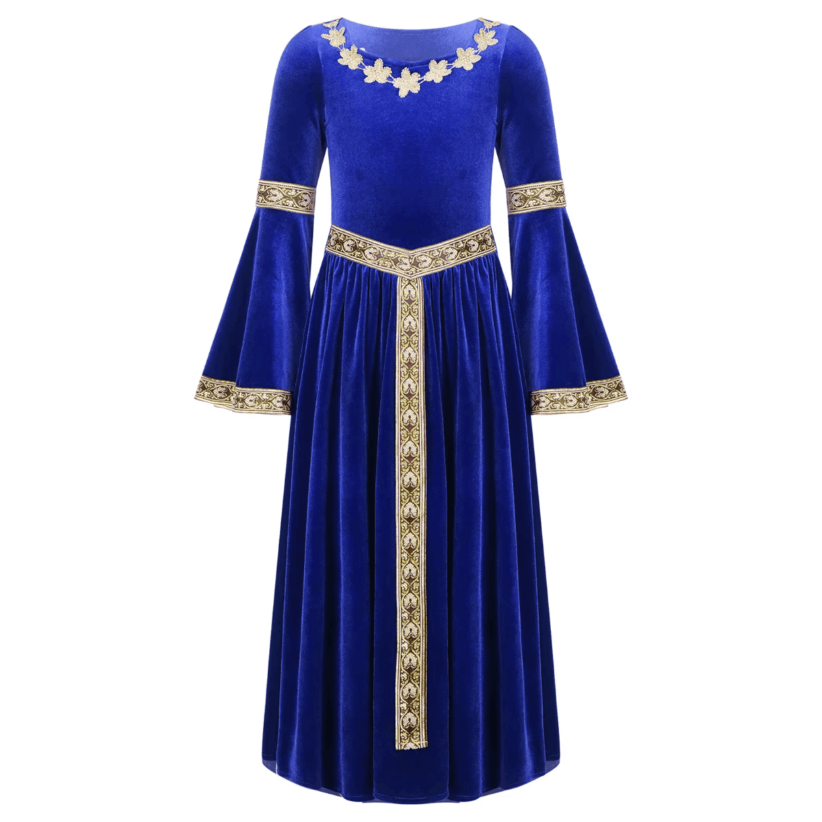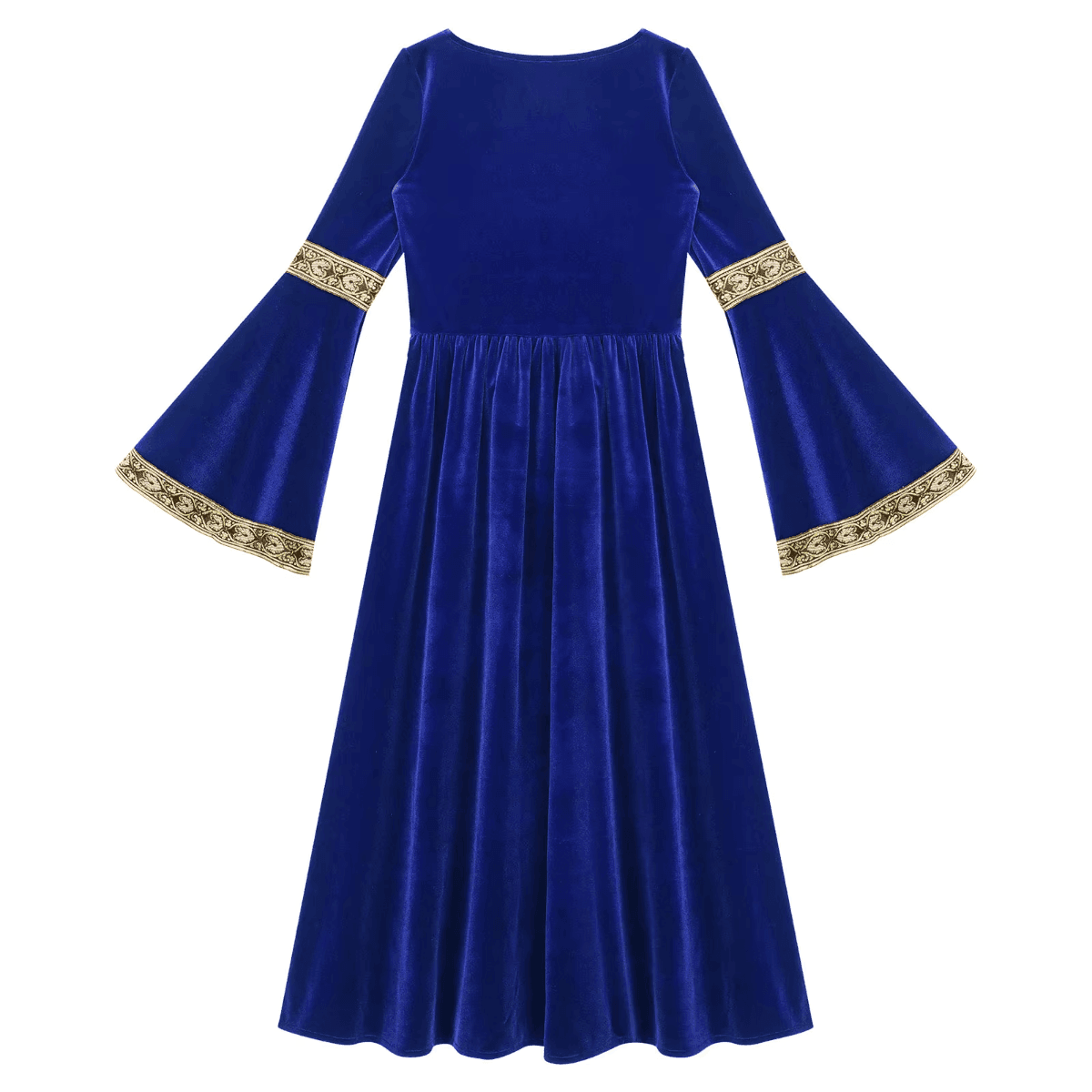 The dress showcases a stunning royal blue color with elegant gold accents, reminiscent of a true medieval princess. The long, flowing sleeves and detailed embroidery add a touch of authenticity, making it perfect for Halloween, themed parties, or just a day of imaginative play. Available in a variety of colors including Purple, Black, Red, Blue, Hot Pink, Pink, Green, and Light Blue, there's a perfect shade for every little princess.