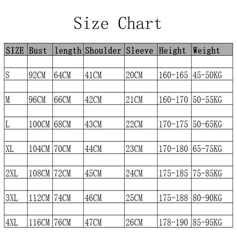 Size Bust Length Shoulder Sleeve Height Weight S 92CM 64CM 41CM 20CM 160-165 45-50KG M 96CM 66CM 42CM 21CM 165-170 50-55KG L 100CM 68CM 43CM 22CM 170-175 50-65KG XL 104CM 70CM 44CM 23CM 175-180 65-75KG 2XL 108CM 72CM 45CM 24CM 175-185 75-85KG 3XL 112CM 74CM 46CM 25CM 175-185 85-95KG 4XL 116CM 76CM 47CM 26CM 178-190 85-95KG