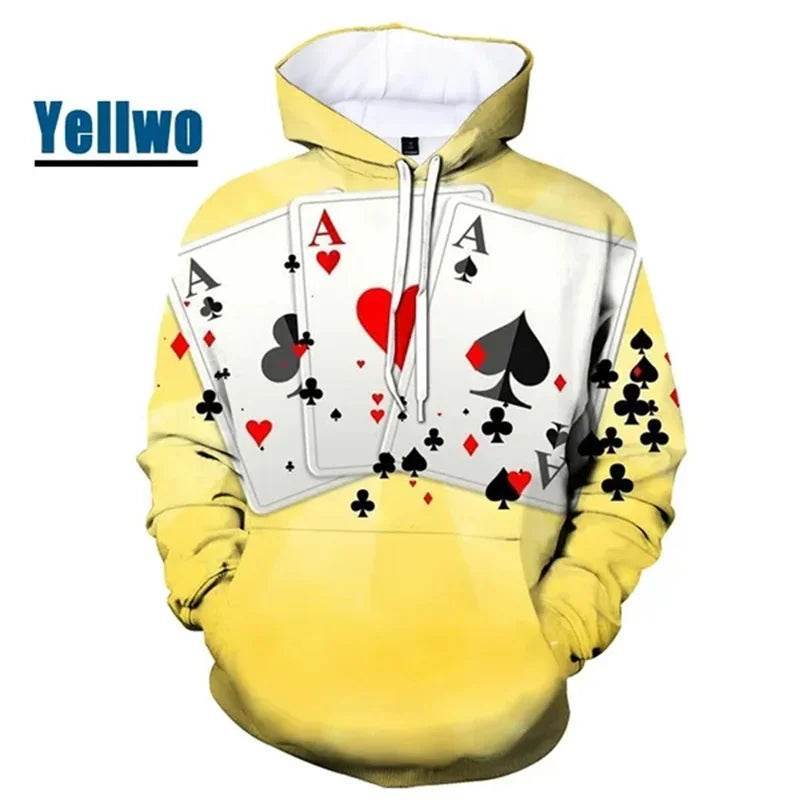Elevate your casual wardrobe with the eye-catching Men 3D King Poker Graphics Hoodies by Oufisun. Perfect for game nights or a casual stroll, these hoodies combine comfort with a bold statement. The vibrant 3D poker graphics, featuring playing cards, dice, and poker chips, bring a playful yet stylish edge to your look.