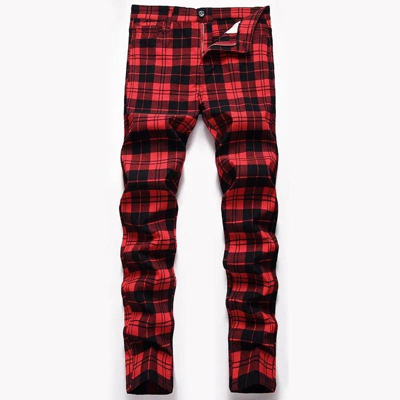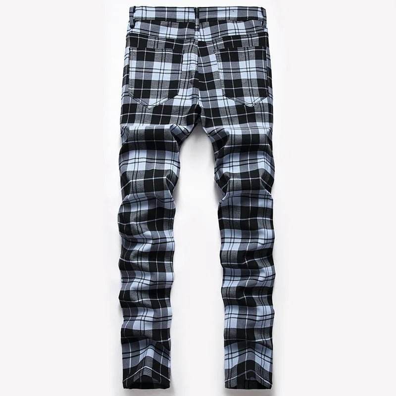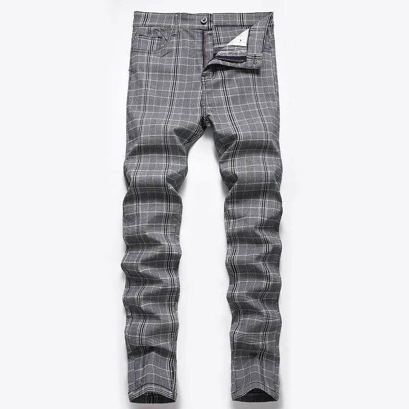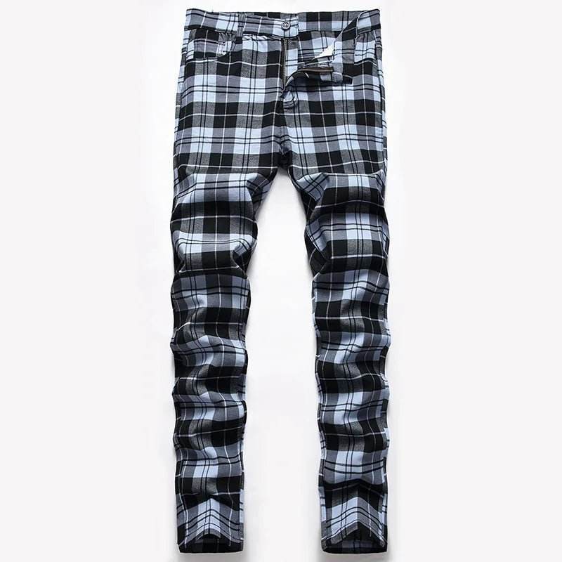 The images showcase the sleek, modern design of these chino pants, highlighting their slim-fit cut and stylish appearance. The plaid pattern adds a unique touch, making them stand out in any setting.