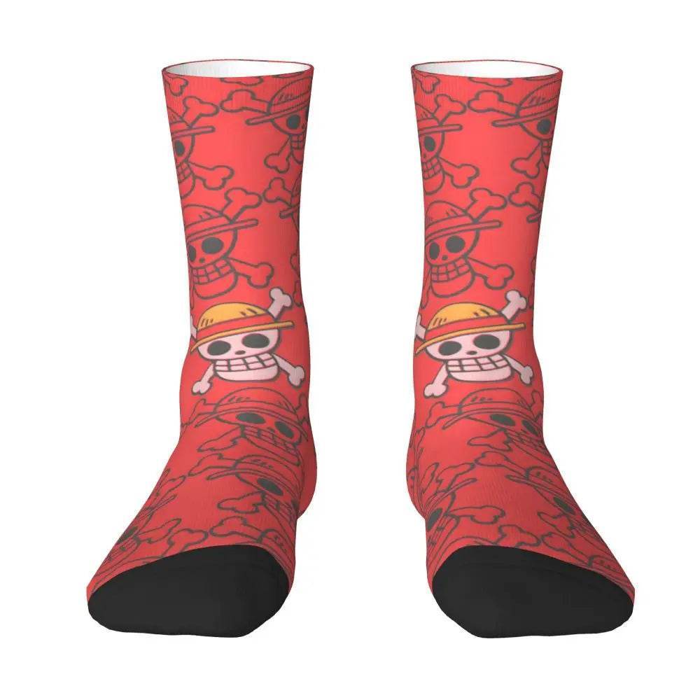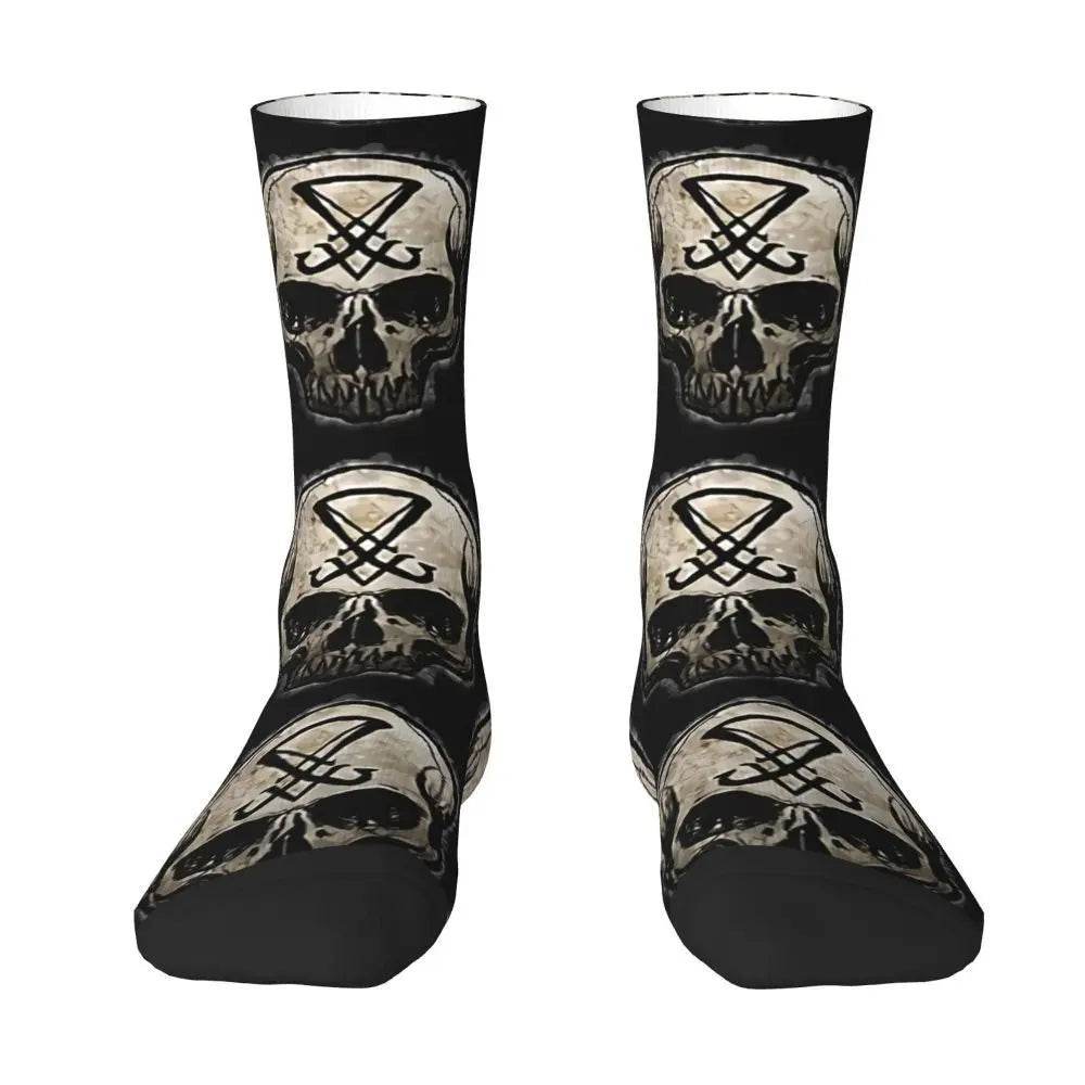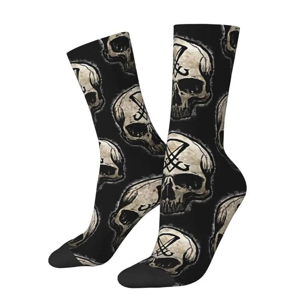 The images showcase the striking design of these socks, highlighting the intricate details of the skull and bones pattern. The black and white contrast adds a classic touch, making them versatile for any wardrobe.