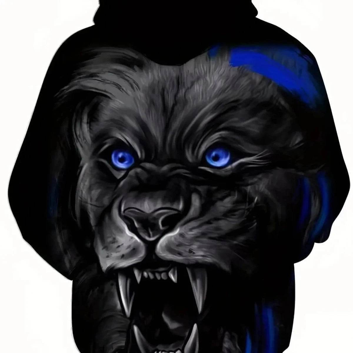 The hoodie features a dynamic image of a tiger, with electric blue eyes and a fierce expression, set against a dark background. This powerful imagery is complemented by the hoodie’s comfortable fit and stylish design, making it a standout piece in any setting.