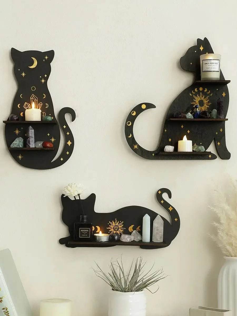 Imagine three charming cat-shaped shelves adorning your wall, each holding candles and decorative items, creating a cozy and enchanting atmosphere. These shelves not only serve as practical storage but also as captivating decor pieces that draw the eye and spark conversation.