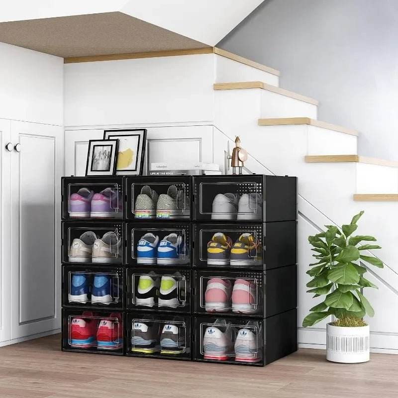 Say goodbye to clutter and hello to a neat, organized closet with our Shoe Organizer Black Stackable 12 Pack Storage Solutions. Perfect for families and individuals who love keeping their spaces tidy, these bins are designed to hold all types of footwear, from sneakers to sandals.