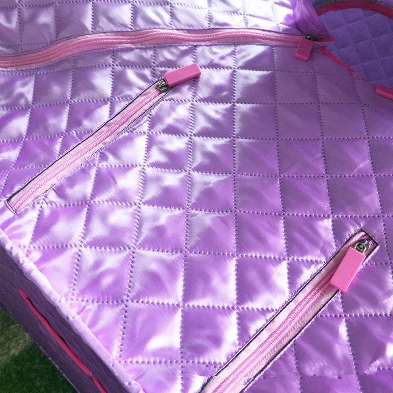 The images showcase a beautifully crafted sauna space with a quilted exterior, exuding both style and comfort. The soft lavender hue adds a calming aesthetic, while the compact design ensures it fits seamlessly into any home setting. The sauna is designed for one person, making it an ideal choice for personal relaxation.