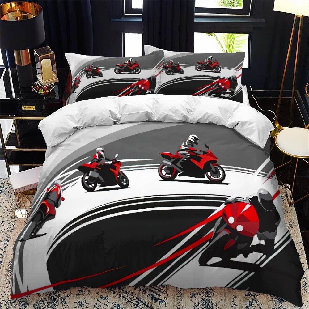 Transform your child's bedroom into a universe of adventure with the Kids Room Motorcycle Bedding Duvet Set. Perfect for young explorers, these duvet sets feature vibrant, cartoon-style designs that bring the excitement of space and speed right into their room. Crafted from 100% polyester, these sets are not only visually stunning but also soft and comfortable, ensuring a cozy night's sleep.