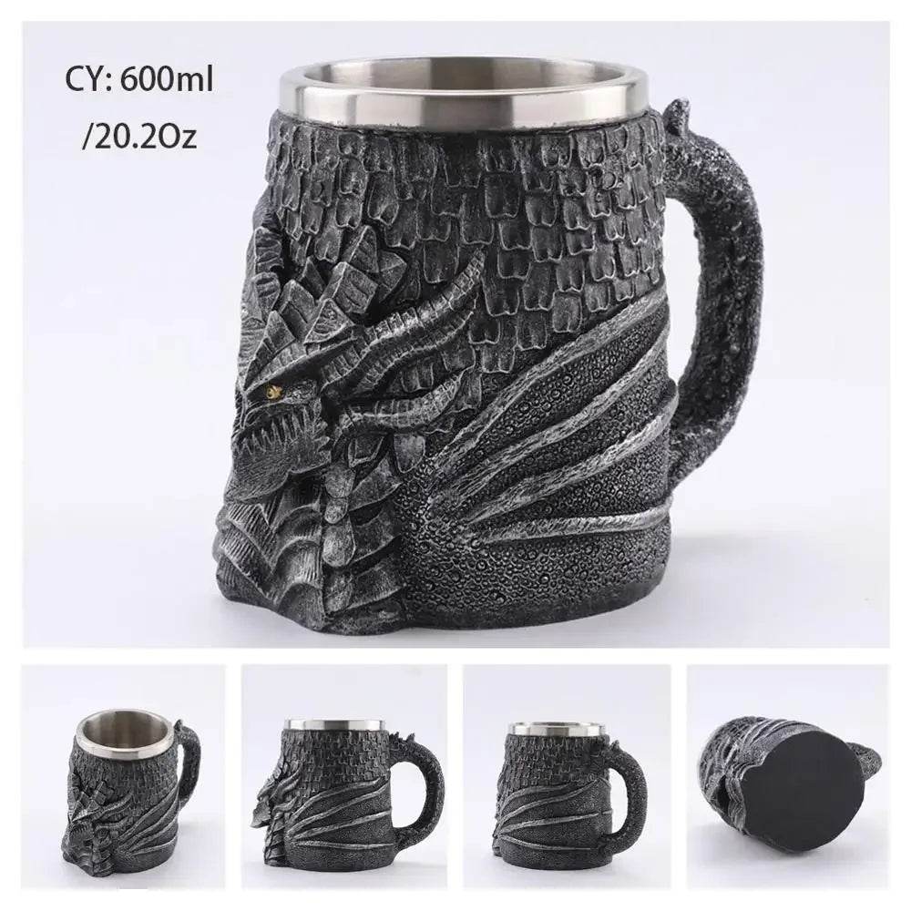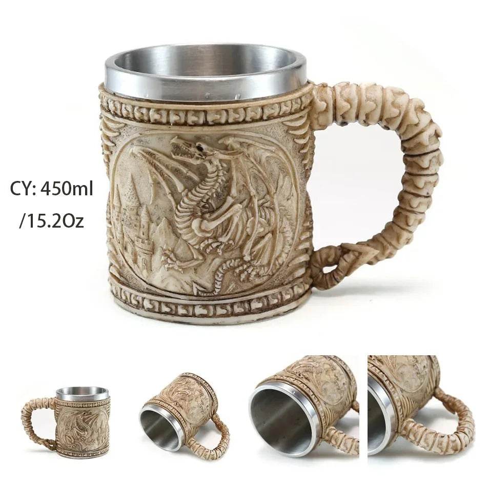 Crafted with intricate details, the mug showcases medieval knights and fantasy elements, making it a standout piece. The robust handle and stainless steel interior ensure durability and a comfortable grip. Choose from a variety of themes like Dragon Bone, Skull King, and Silver Flying Dragon to match your style.