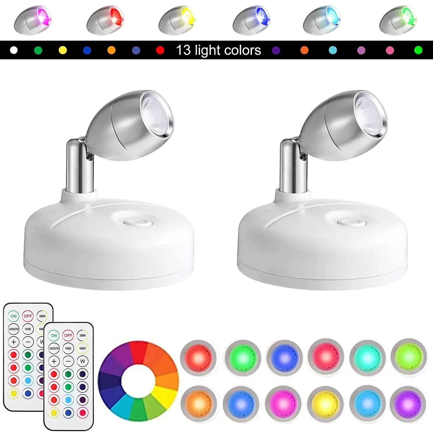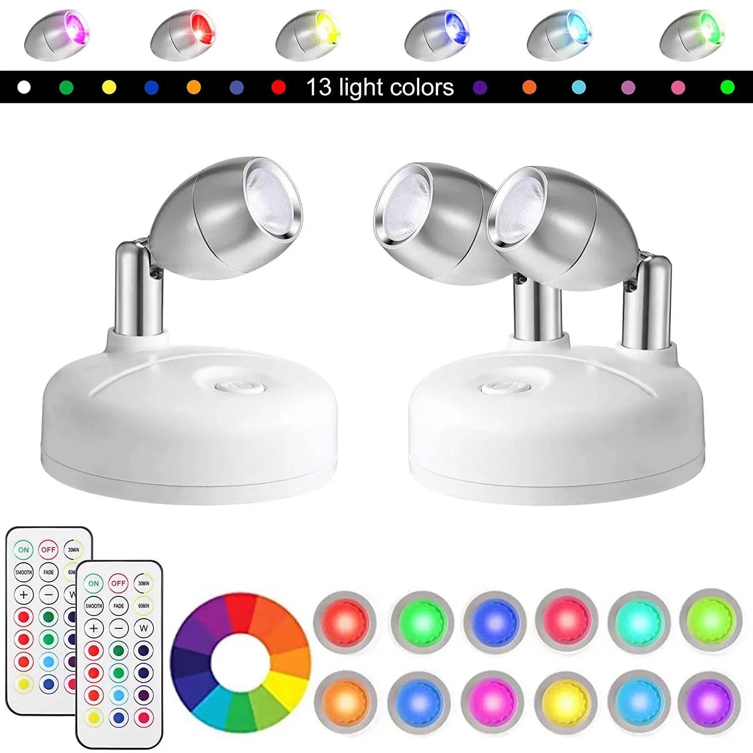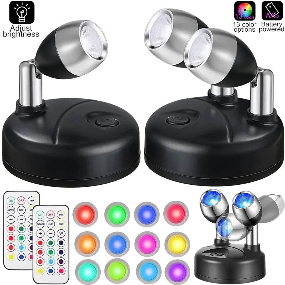 Introducing the Wireless LED-RGB 2pk Rotatable Spotlights, the perfect addition to any room in your home. Whether you're looking to highlight your favorite artwork or create a cozy atmosphere, these spotlights offer a touch of magic with their vibrant colors and adjustable brightness. Choose between the Single Head or Dual Head options, both equipped with convenient remotes for effortless control.