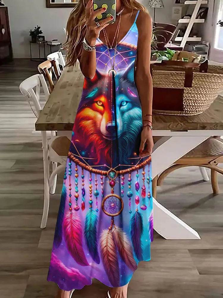 Design: The dress features a stunning 3D bohemian print with intricate dreamcatcher and feather designs, adding a touch of whimsy and charm.