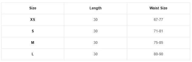 Size Length Waist Size XS 30 67-77 S 30 71-81 M 30 75-85 L 30 80-90
