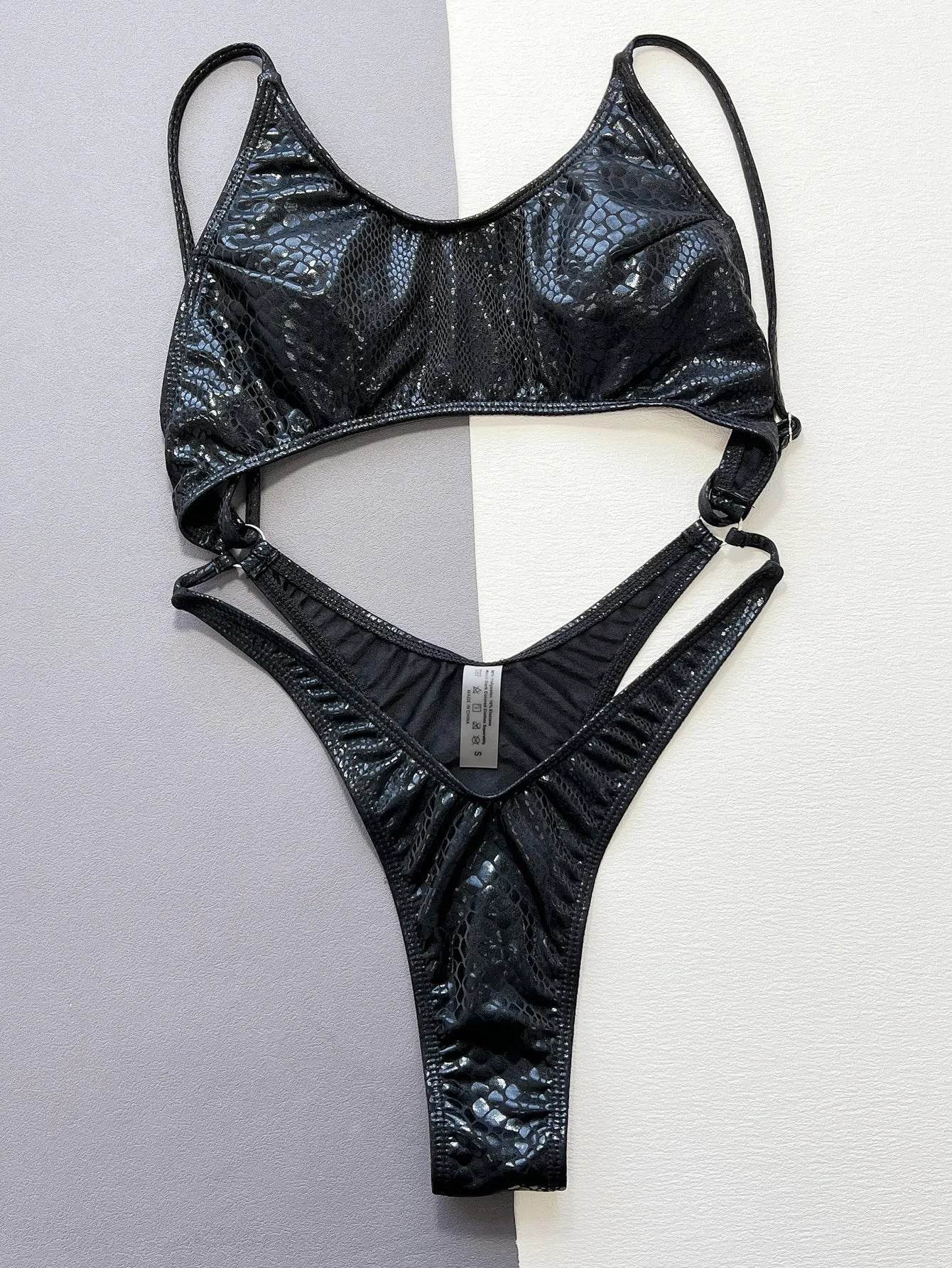 The images showcase the swimwear's sleek and shiny texture, highlighting its luxurious look. The intricate snake print adds a touch of wild elegance, making it a must-have for those who dare to be different.