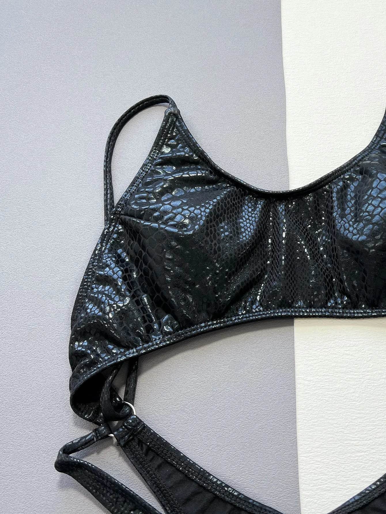 Women Black Snake Print Metallic Swimwear Set