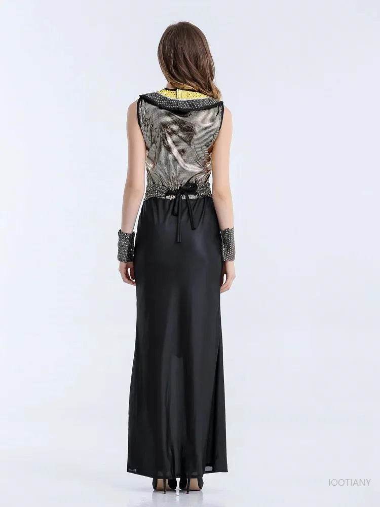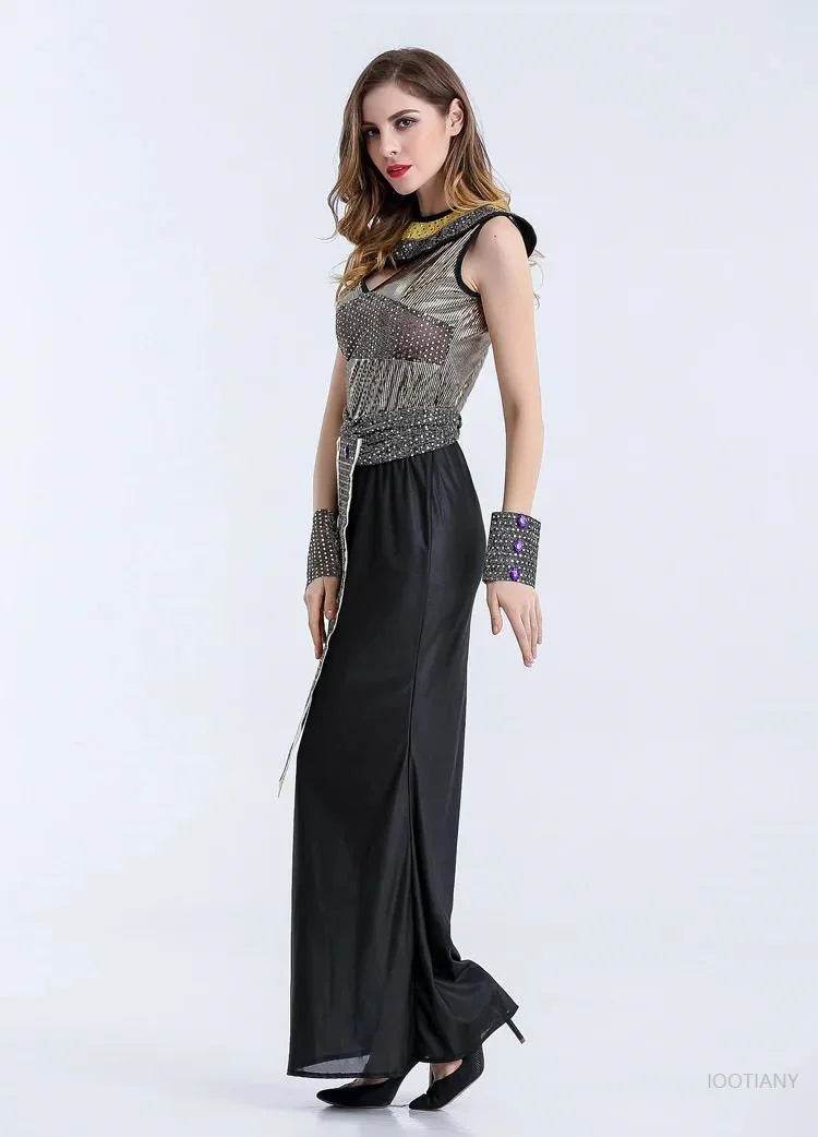 This exquisite costume features a sleek black and gold dress, complete with a long, elegant belt that accentuates your silhouette. The intricate patterned hood adds a touch of mystery and authenticity, making you feel like you've stepped right out of ancient history.