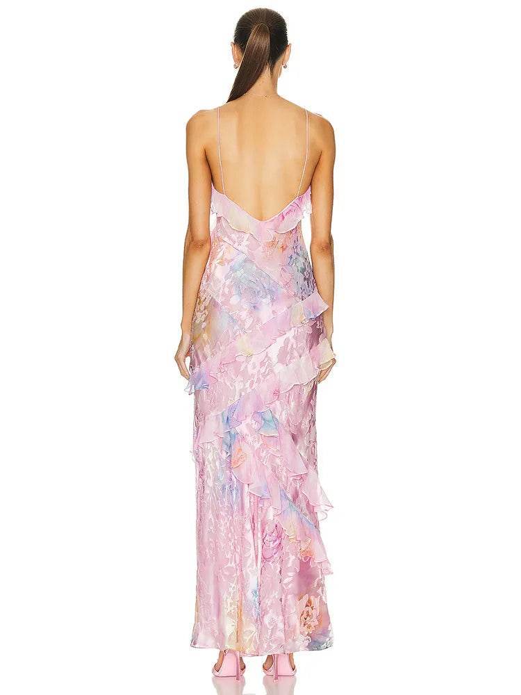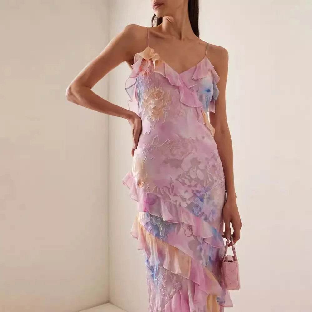 In the images, the dress is beautifully showcased, highlighting its delicate floral design and flowing silhouette. The pink floral dress stands out against a white background, emphasizing its vibrant colors and intricate patterns. The pastel floral dress, set against a plain background, exudes a soft, romantic vibe, perfect for any summer occasion.