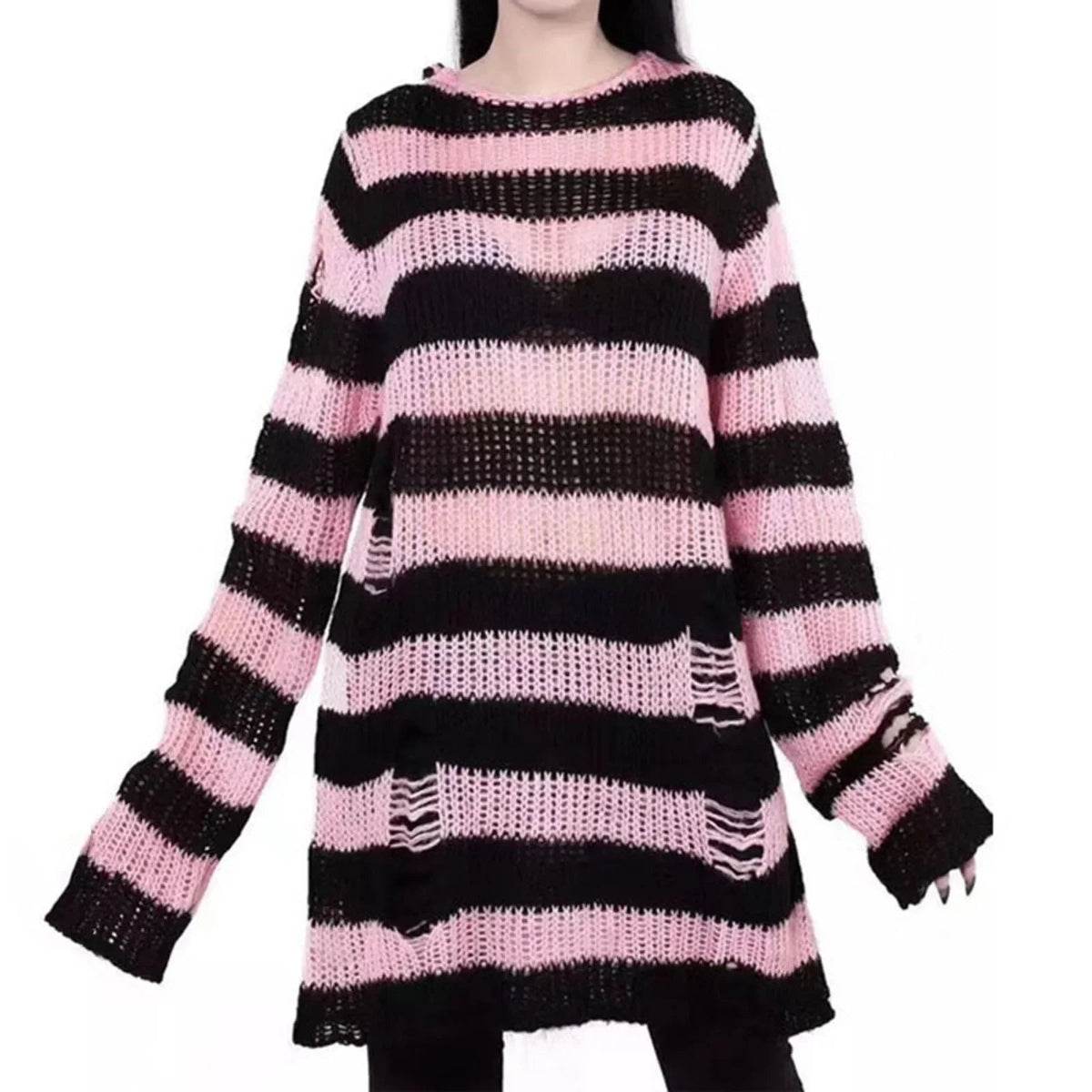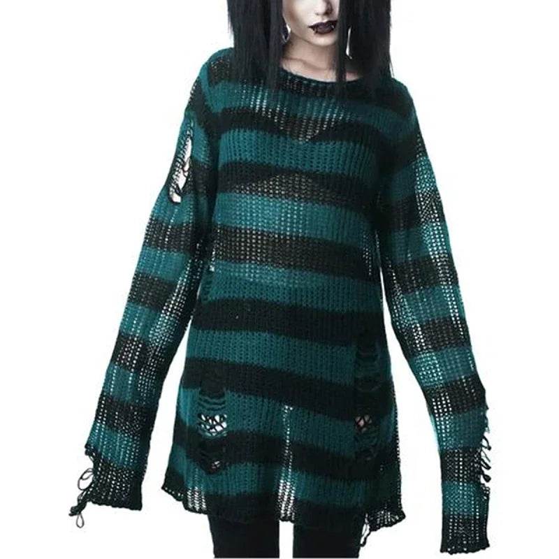 Introducing the Women Gothic Striped Hollow Long Sweater by lunoakvo, a perfect blend of comfort and edgy style. Crafted from high-quality materials, these sweaters feature a unique striped design with hollow details, making them a standout piece for any wardrobe. Whether you're heading out for a casual day or a night out, this sweater ensures you stay warm while showcasing your bold fashion sense.