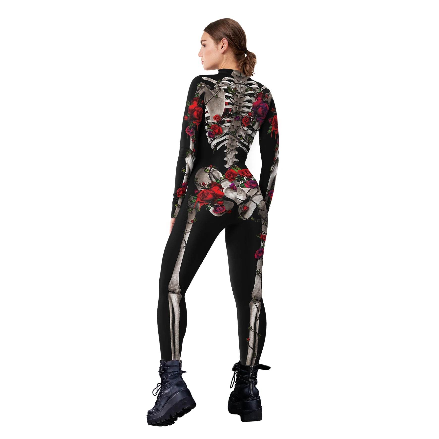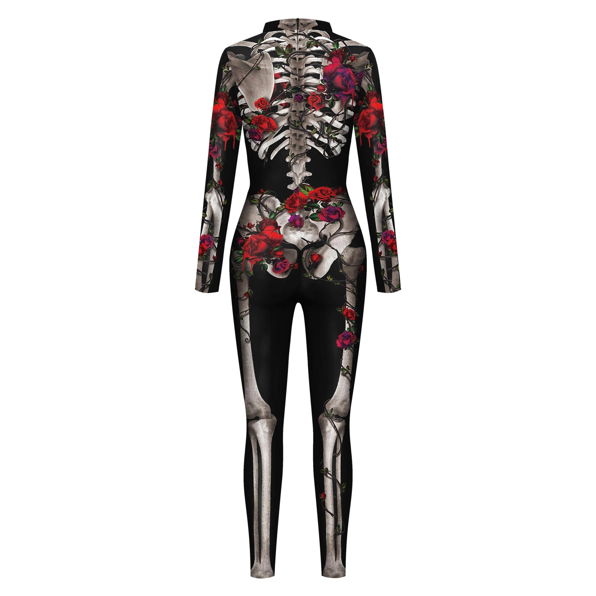 Crafted from a blend of polyester and spandex, this jumpsuit offers a comfortable and flexible fit, perfect for all-night wear. The intricate knit design showcases a detailed skeleton print adorned with vibrant roses, adding a touch of gothic romance to your Halloween ensemble. Whether you're attending a costume party or a cosplay event, this outfit ensures you stand out in the crowd.