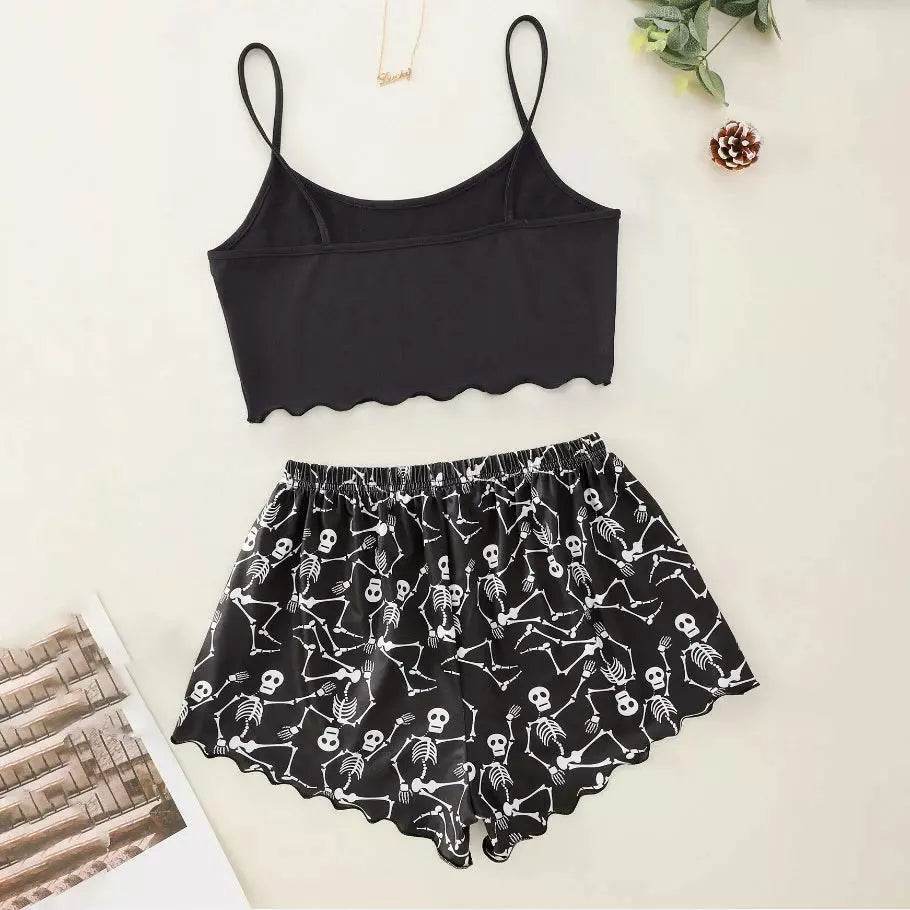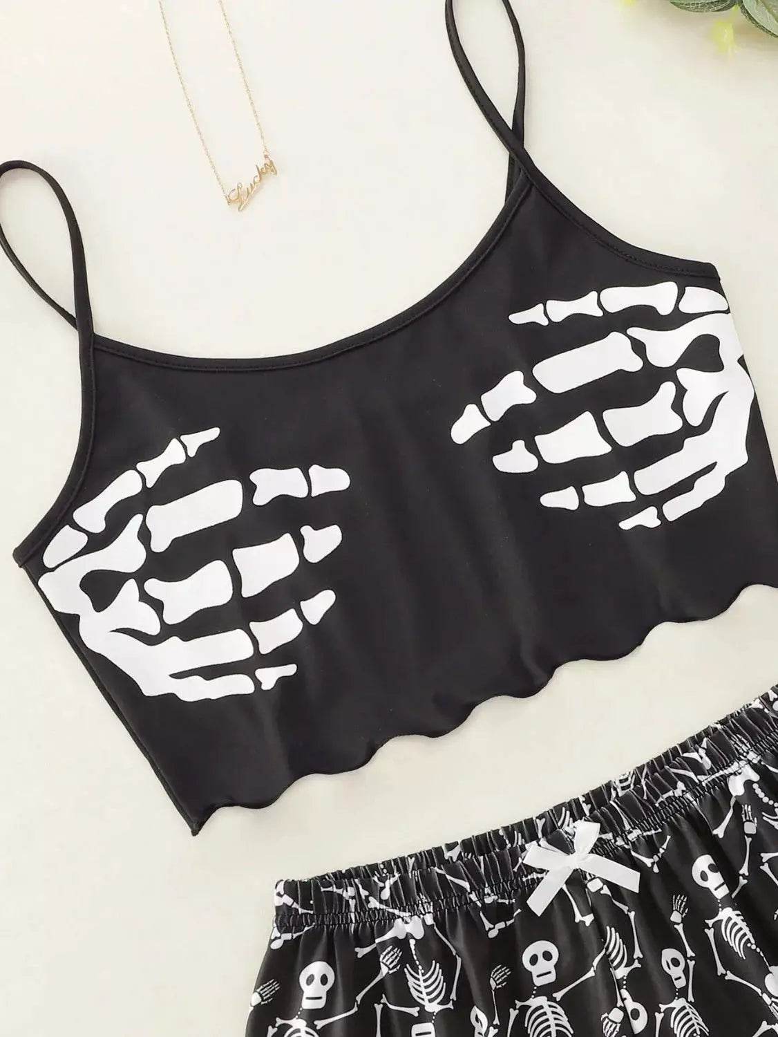 Get ready to embrace the Halloween spirit with our Women's Halloween Sleeveless Crop Pajama Set. Perfect for those warm summer nights, this set combines comfort and style with a playful Gothic flair. The sleeveless crop top features delicate spaghetti straps and a striking skeleton hand design, adding a touch of spooky fun to your nighttime routine.