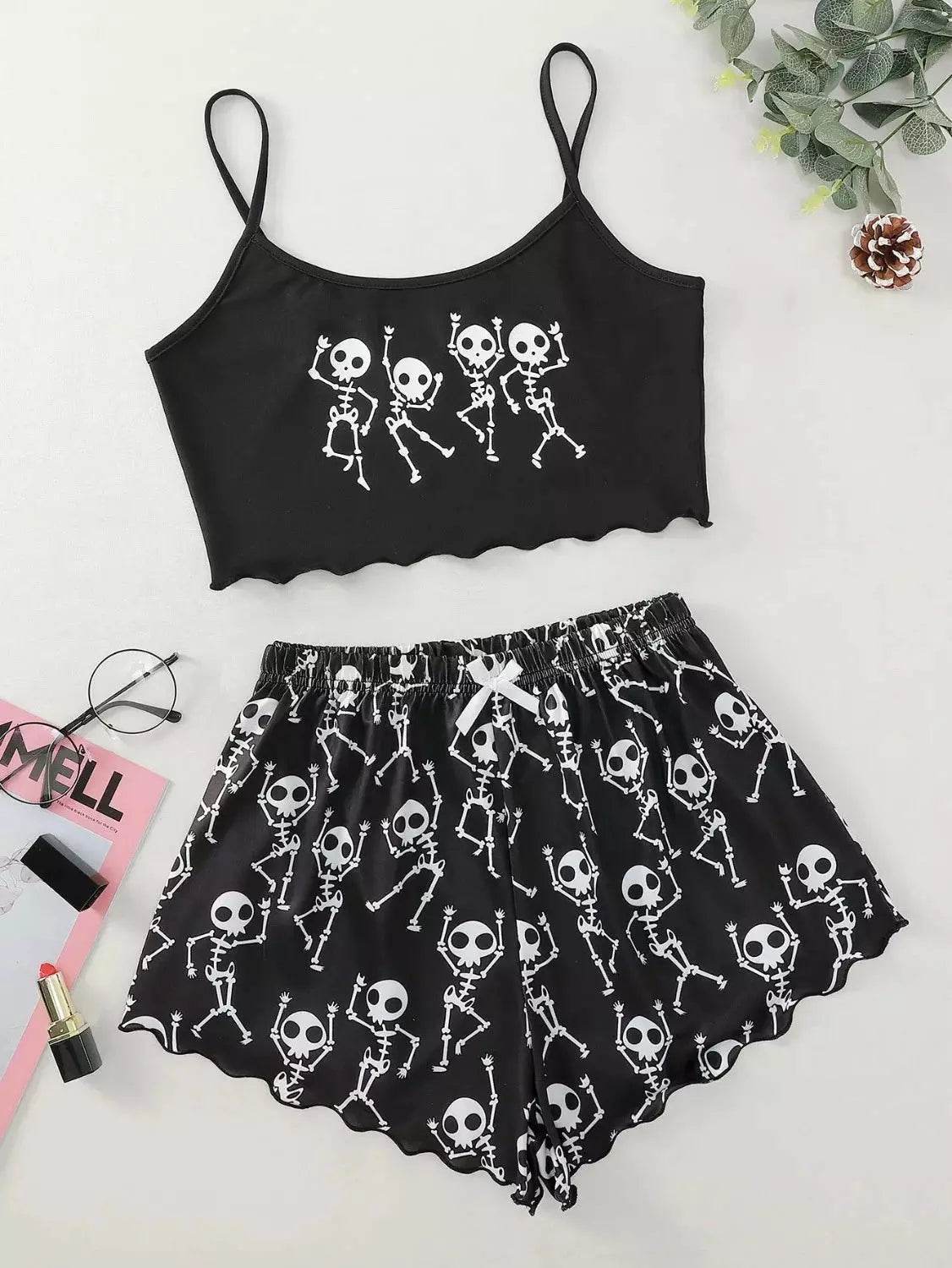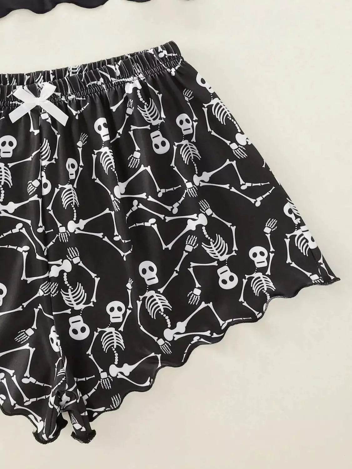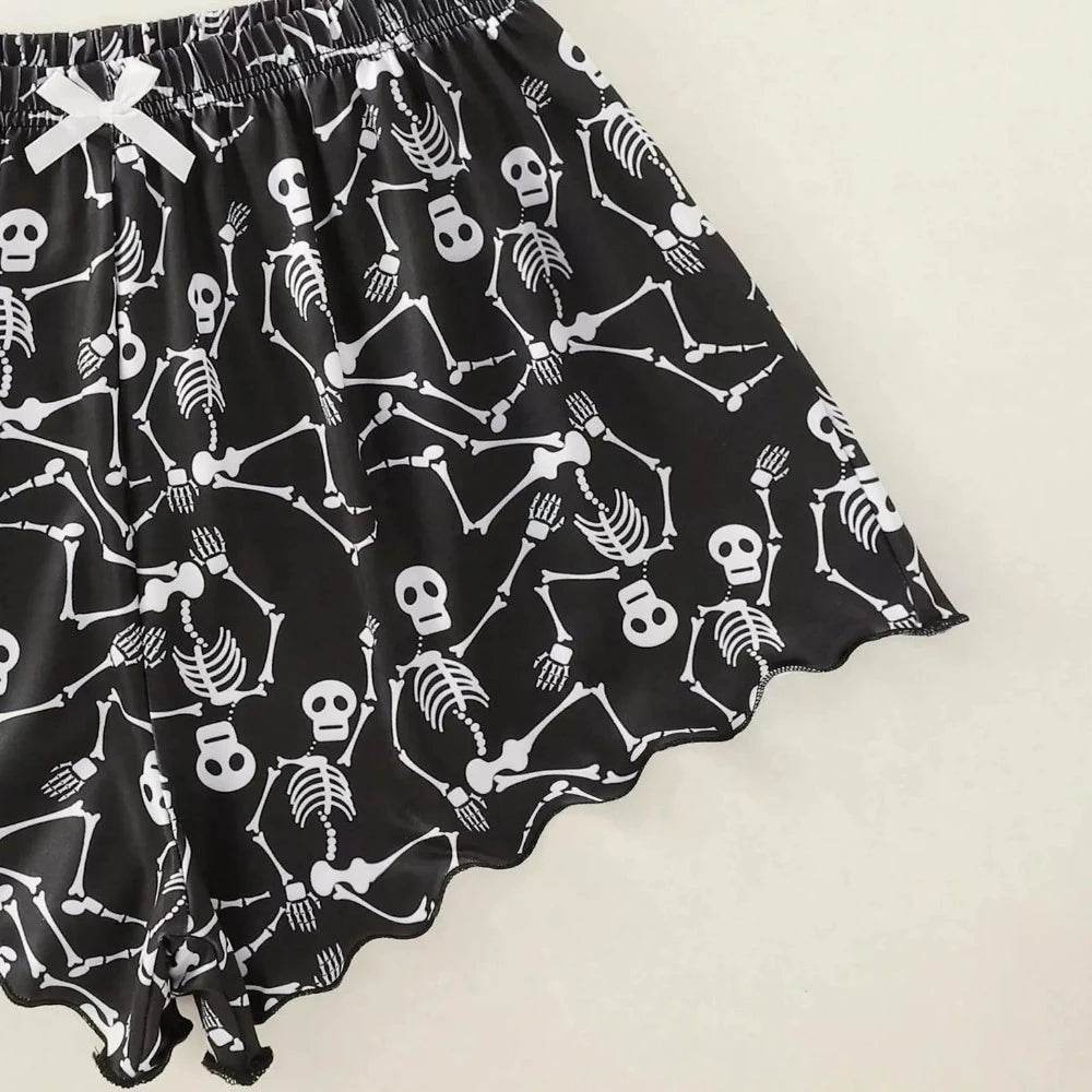 Crafted from breathable fabric, this pajama set ensures a serene and comfortable sleep. The soft material gently caresses your skin, making it ideal for lounging or catching some Z's. The shorts are adorned with a whimsical skeleton pattern, perfectly matching the top for a cohesive look.