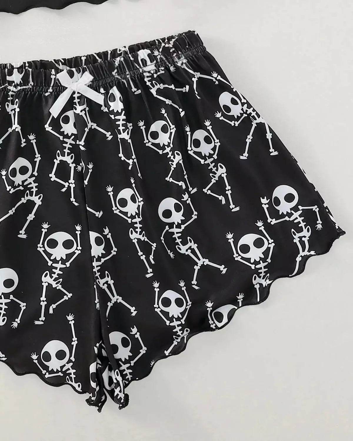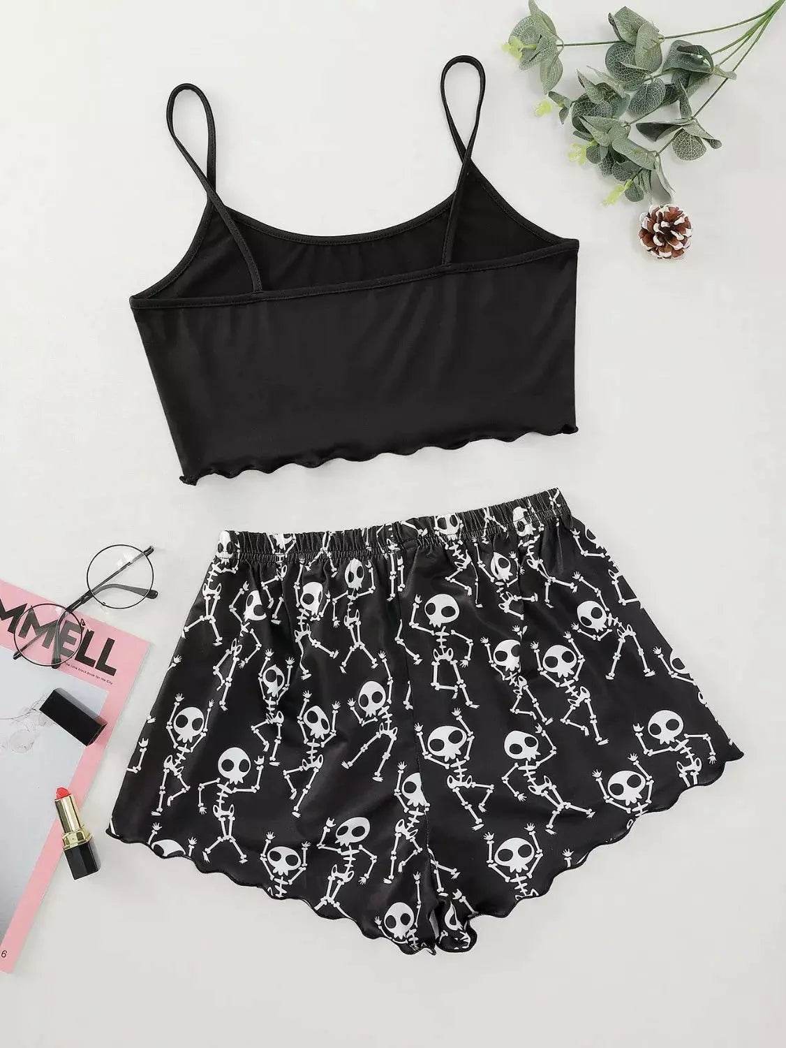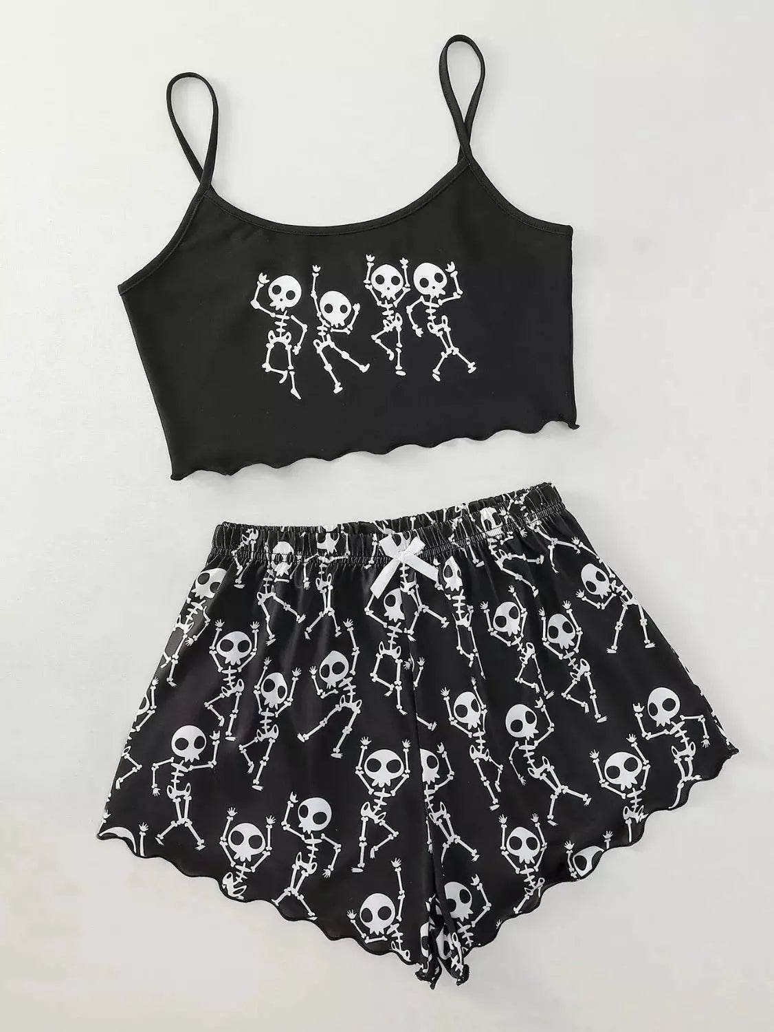 Crafted from breathable fabric, this pajama set ensures a serene and comfortable sleep. The soft material gently caresses your skin, making it ideal for lounging or catching some Z's. The shorts are adorned with a whimsical skeleton pattern, perfectly matching the top for a cohesive look.