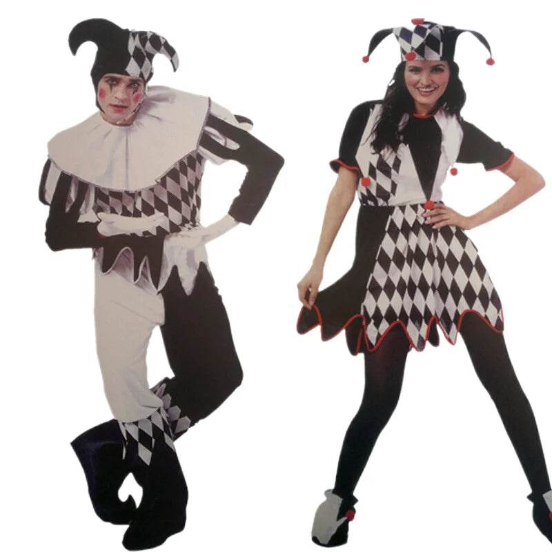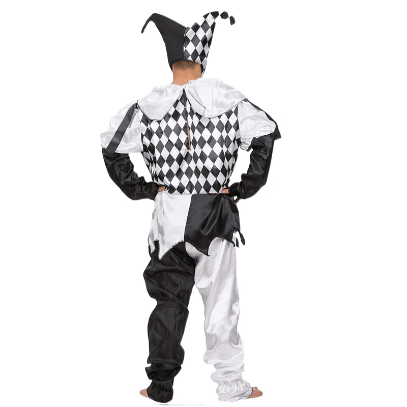 Featuring a striking black and white harlequin pattern, this costume captures the essence of medieval fashion while adding a playful twist. The set includes a dress with bold diamond patterns and a jester hat adorned with playful pom-poms, ensuring you stand out in any crowd. The attention to detail in the design reflects the quality and craftsmanship synonymous with Coldker, a name known for unique and stylish apparel.