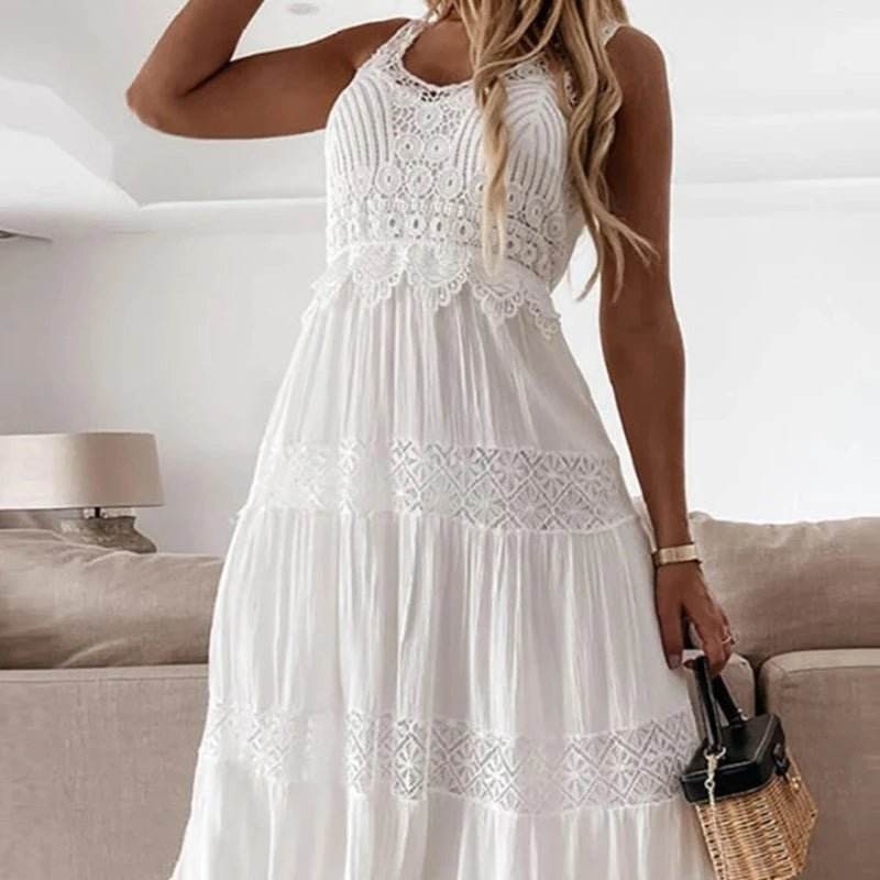 The dress features intricate lace detailing and a flowing silhouette that captures the essence of bohemian style. Its elegant white color complements any skin tone, making it a versatile addition to your wardrobe. Pair it with sandals and a sun hat for a complete summer look.