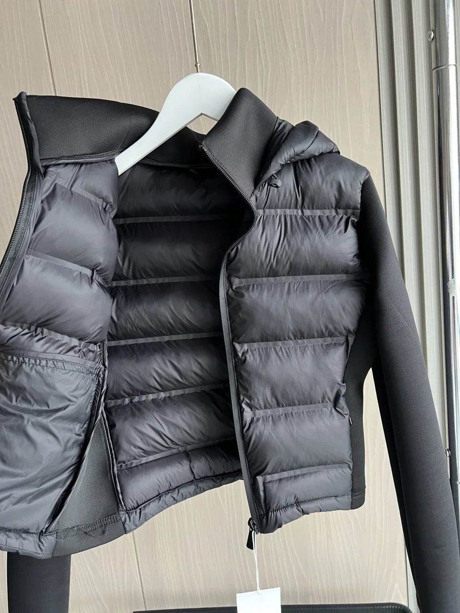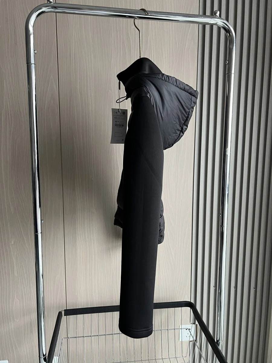 The jacket's sleek black design is highlighted in the images, showcasing its elegant look both on a hanger and against a white background. The hood adds an extra layer of warmth and style, making it a practical choice for winter wear.
