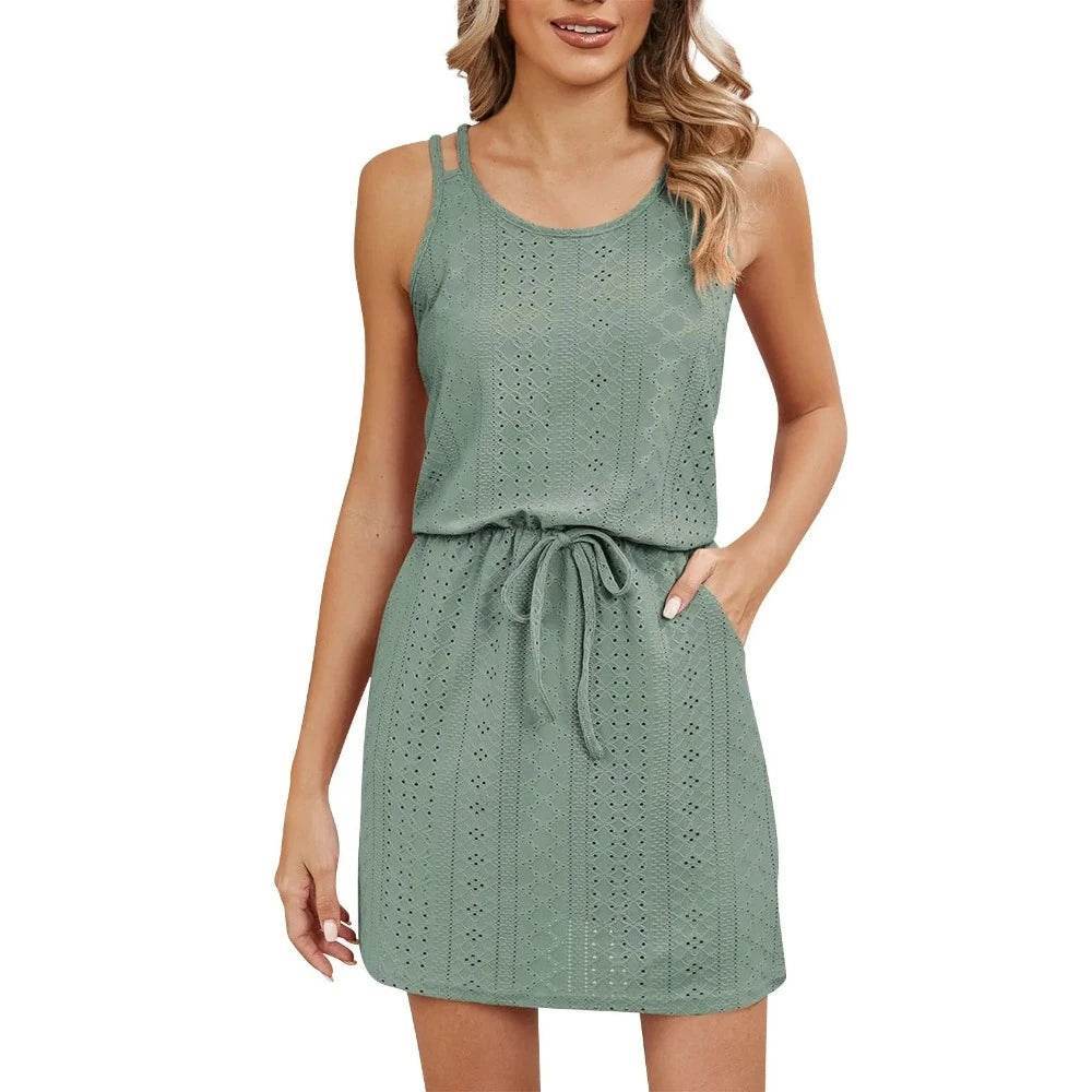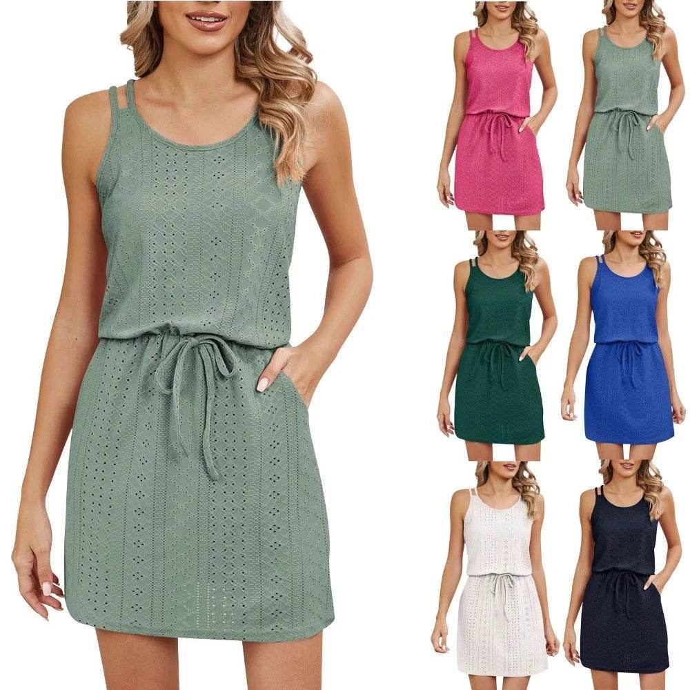 Available in a variety of vibrant colors including White, Dark Green, Hot Pink, Blue, Mint Green, and Navy, this dress offers something for every taste. The adjustable drawstring waist provides a flattering fit, while the sleeveless design allows for easy movement. Choose from sizes S to XXL to find your perfect fit.