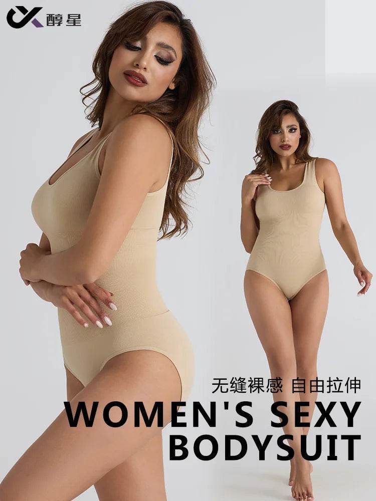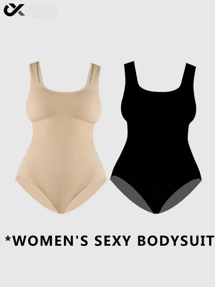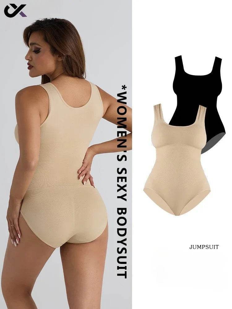 The images showcase the romper's sleek design, highlighting its seamless fit and stylish appeal. The model demonstrates how the romper contours to the body, emphasizing its flattering silhouette. The inset of the black bodysuit offers a glimpse of another color option, providing more choices to suit your personal style.