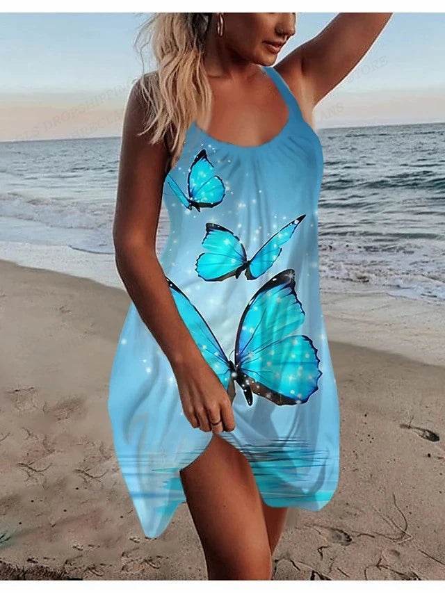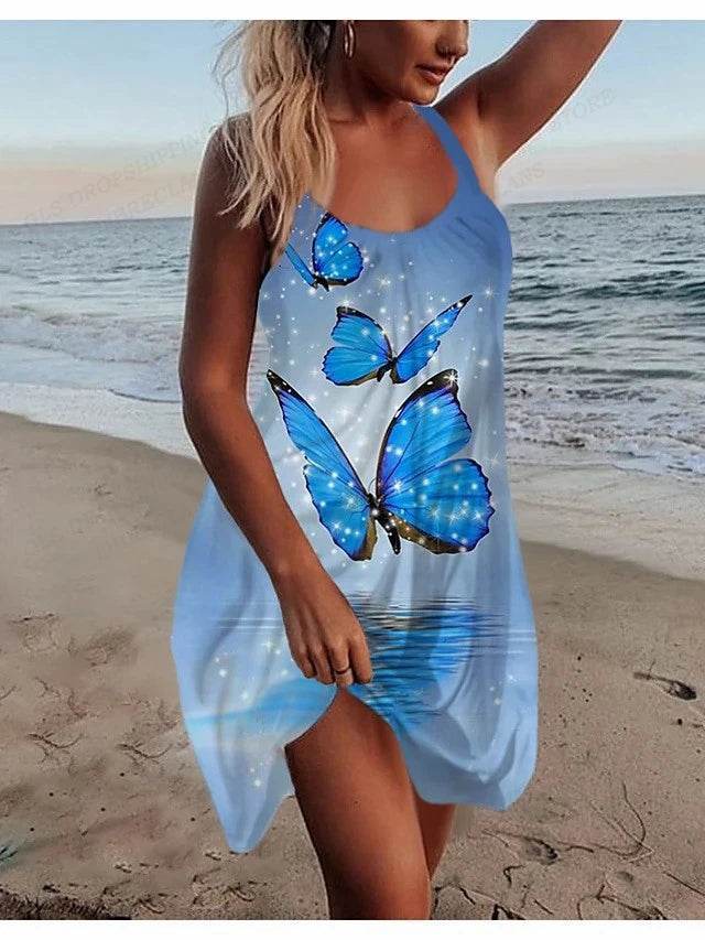 The dress features a stunning design with vibrant colors and patterns that capture the essence of summer. The images showcase its beautiful blue hues and captivating butterfly motifs, making it a standout piece in any wardrobe. The flowing fabric and eye-catching design make it ideal for those who love to make a statement.