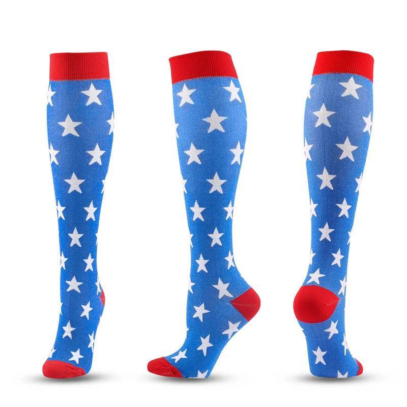 Step into comfort and style with the Women Striped Red White Blue Compression Socks. Your legs will thank you!