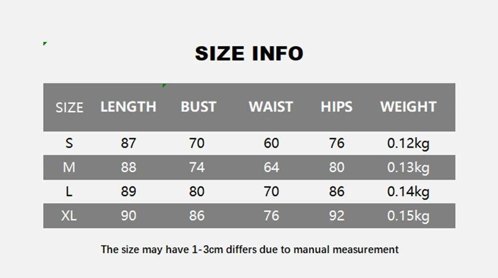 Size Length (cm) Bust (cm) Waist (cm) Hips (cm) Weight (kg) S 87 70 60 76 0.12 M 88 74 64 80 0.13 L 89 80 70 86 0.14 XL 90 86 76 92 0.15