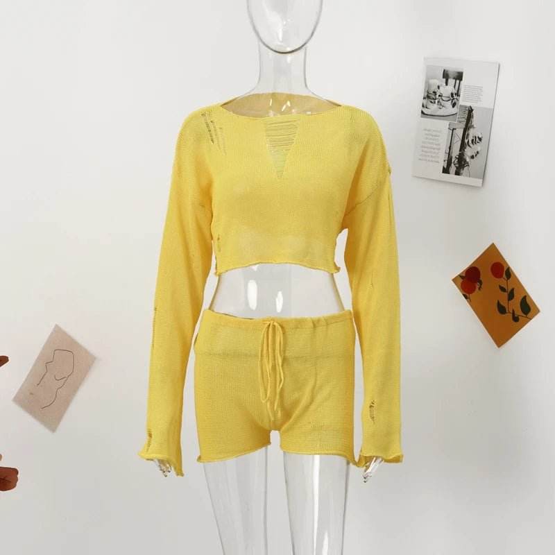 Embrace your inner goddess with our Sexy Beach See Through Crop Top Shorts Set! This knitted two-piece suit boasts intricate lace-up accents and a hint of mystery with its sheer fabric. Perfect for beach holidays or sunny days out, this outfit will make you feel like a star in no time.
