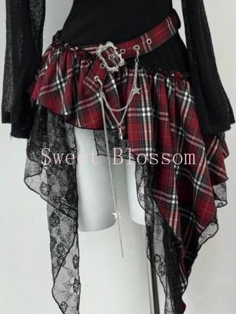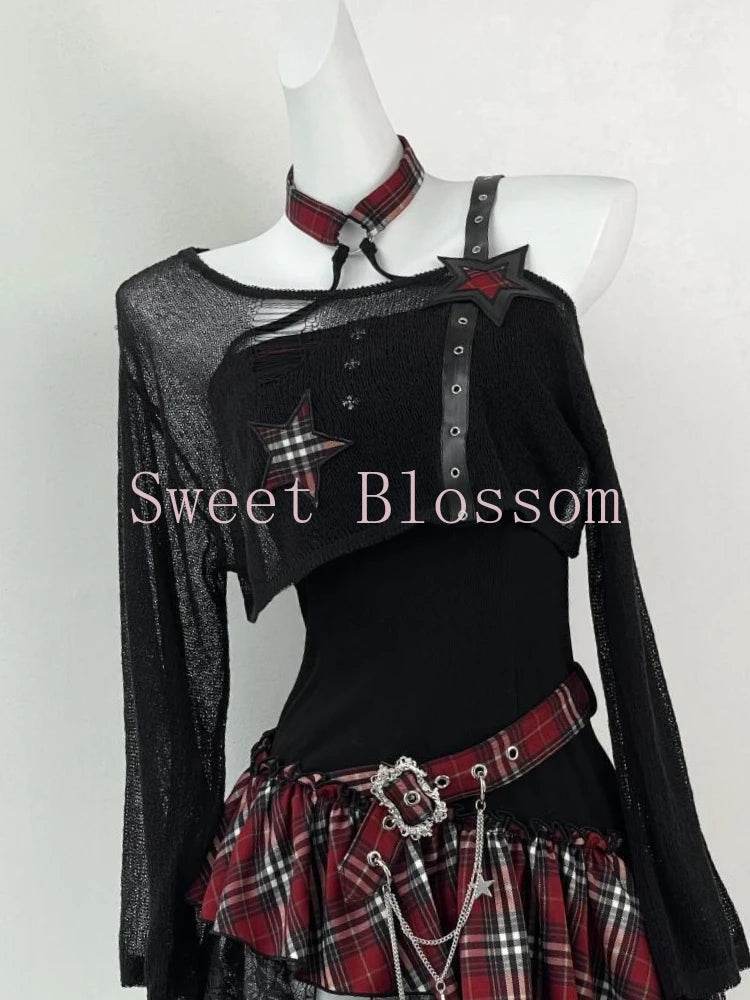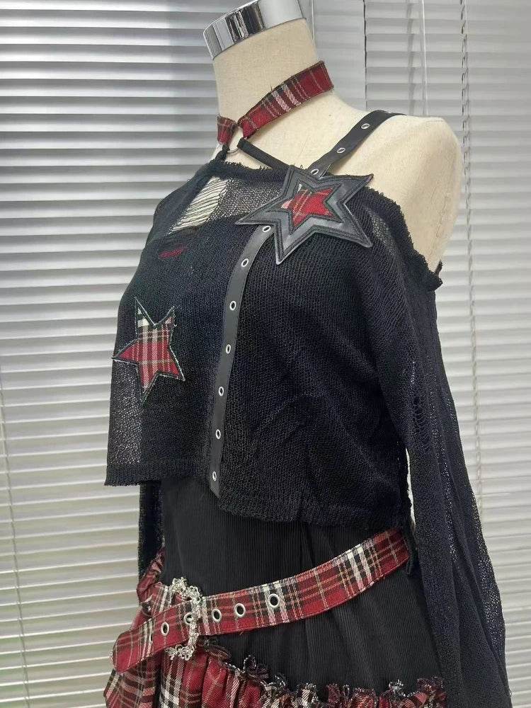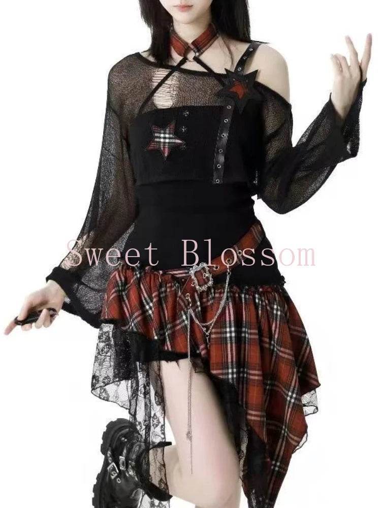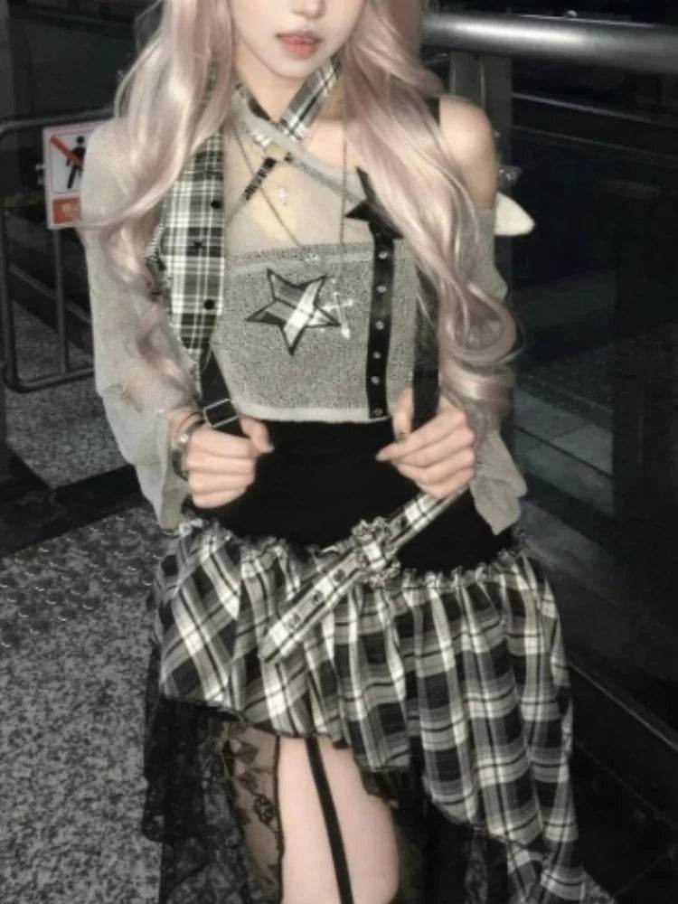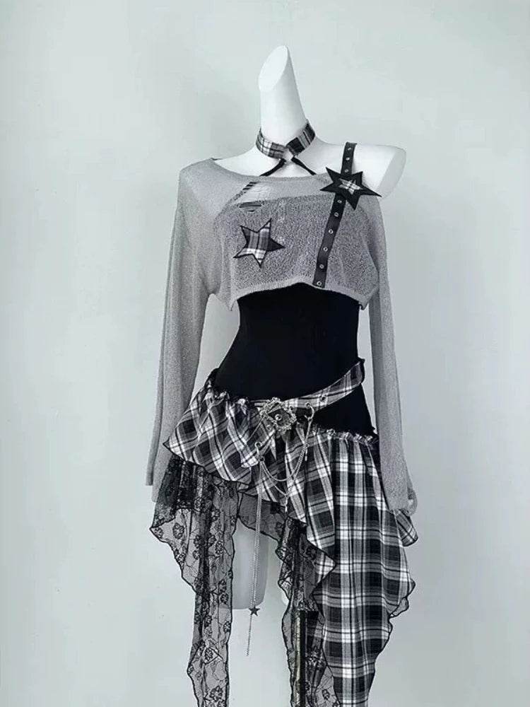 This two-piece set features an irregular hemline and plaid accents that add a touch of rebellious flair. The sheer sleeves and asymmetrical appliques create a striking silhouette, making it ideal for both casual outings and special occasions. Available in classic black and grey, it offers versatility and style.